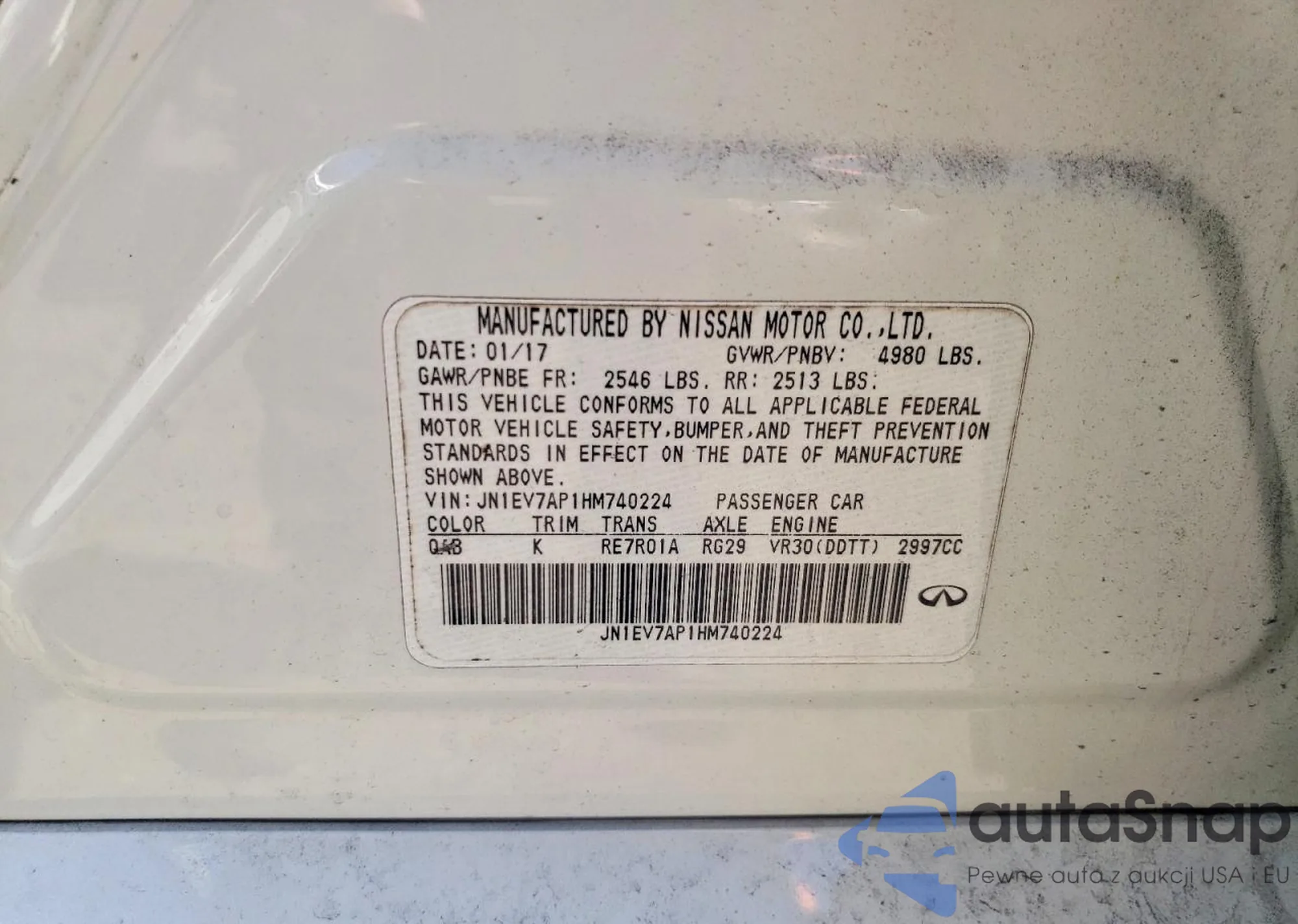 Автомобиль Infiniti Q50 2017 (VIN JN1EV7AP1HM740224) ранее не участвовал в торгах. Документы чистые, пробег соответствует или ниже среднего по рынку. Продаётся страховой компанией — рекомендуем покупку. Доставка в порт займет около 6–8 недель.