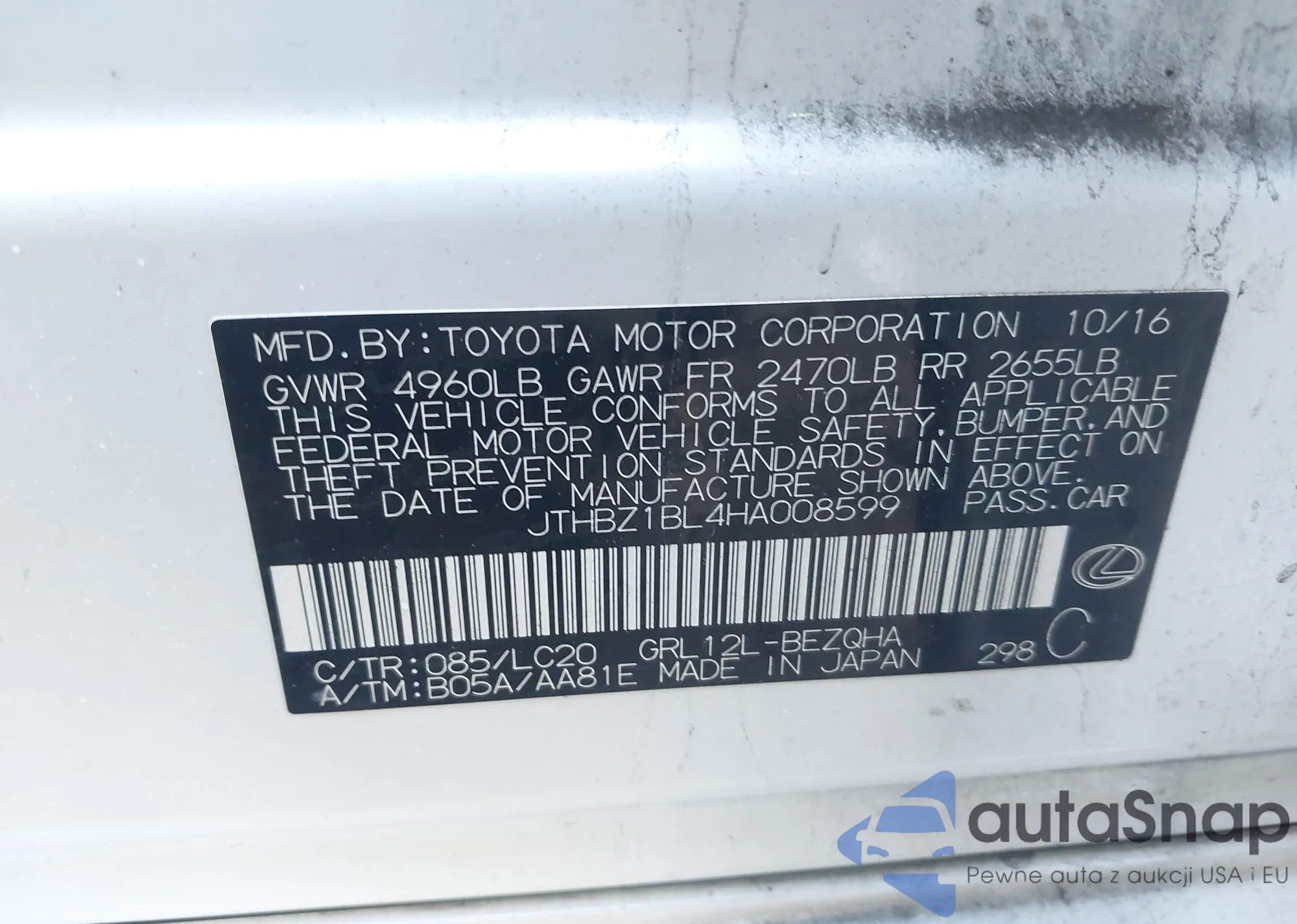 • VIN: JTHBZ1BL4HA008599