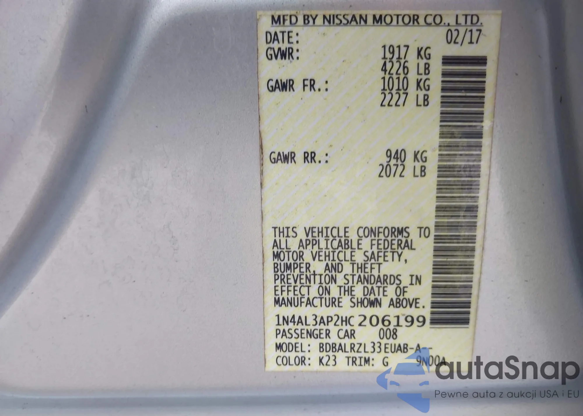 • VIN: 1N4AL3AP2HC206199