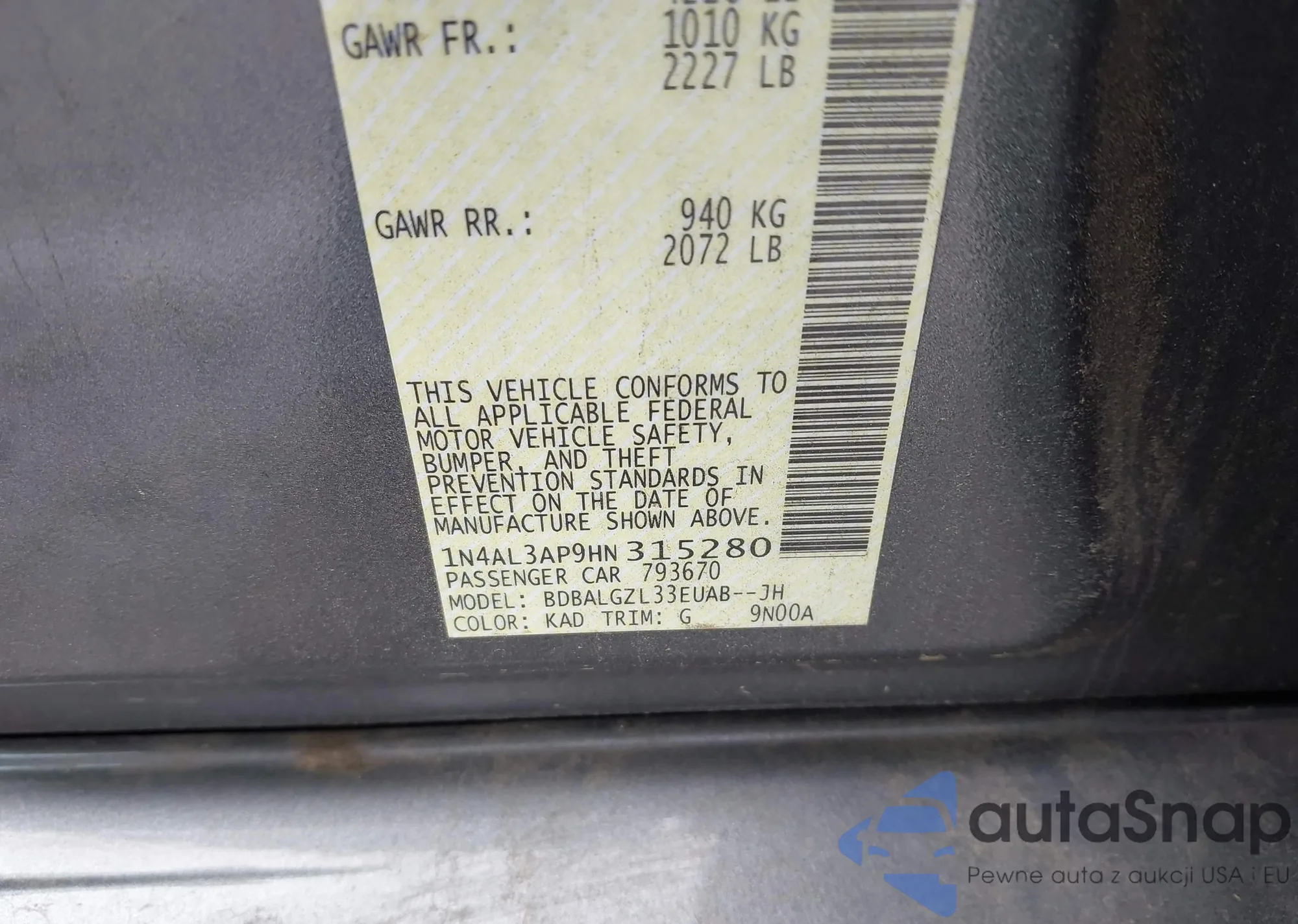 VIN: 1N4AL3AP9HN315280