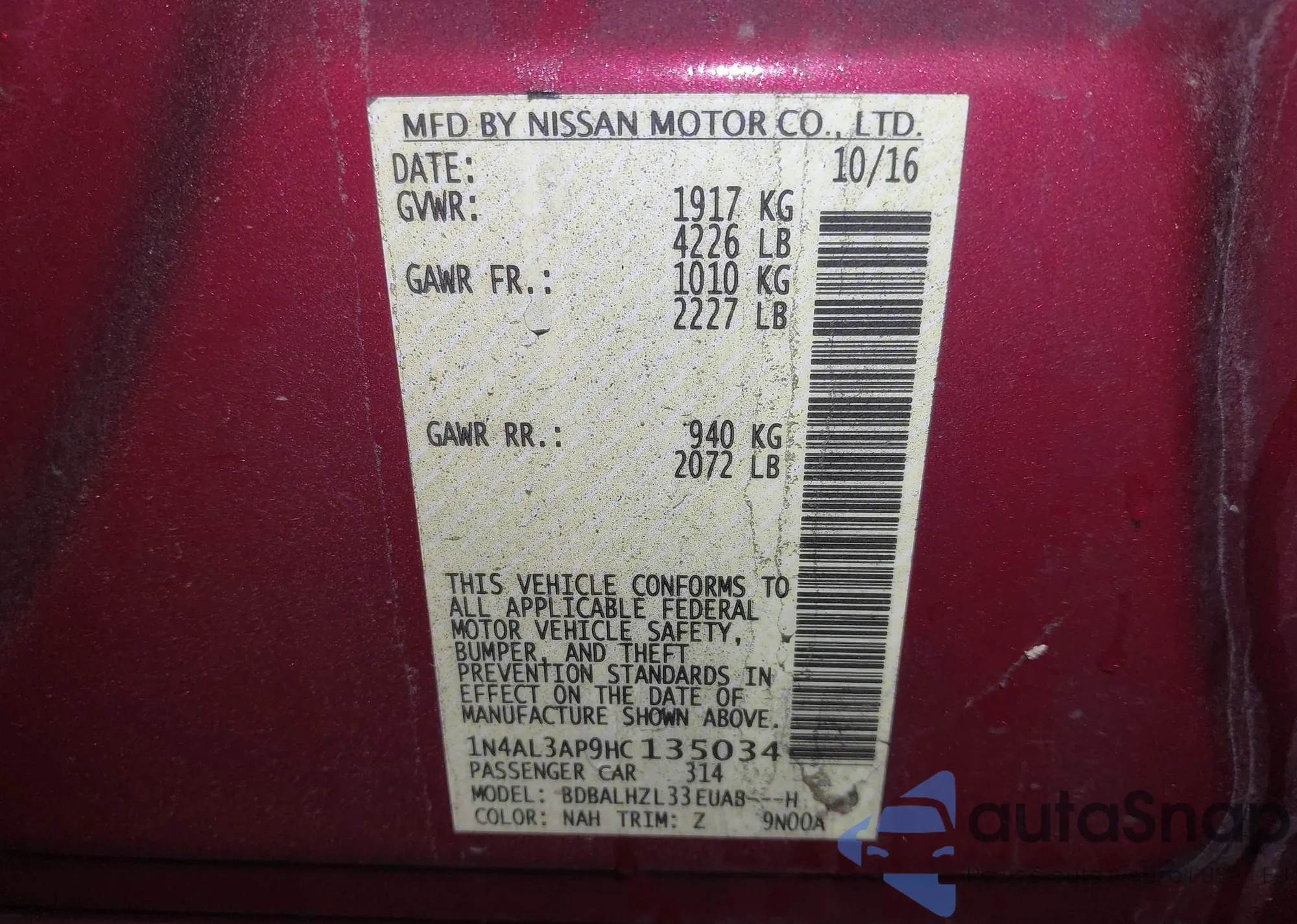 • VIN: 1N4AL3AP9HC135034
