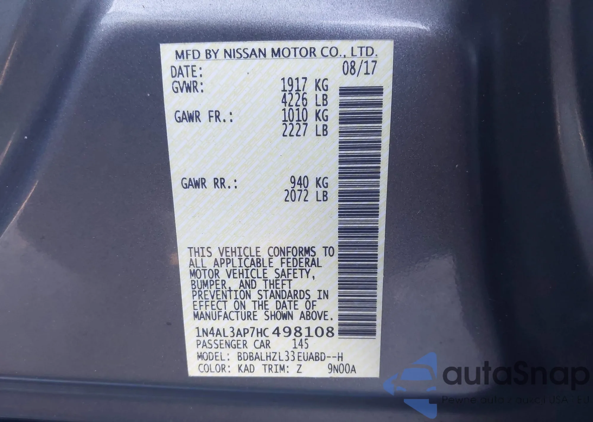 VIN: 1N4AL3AP7HC498108