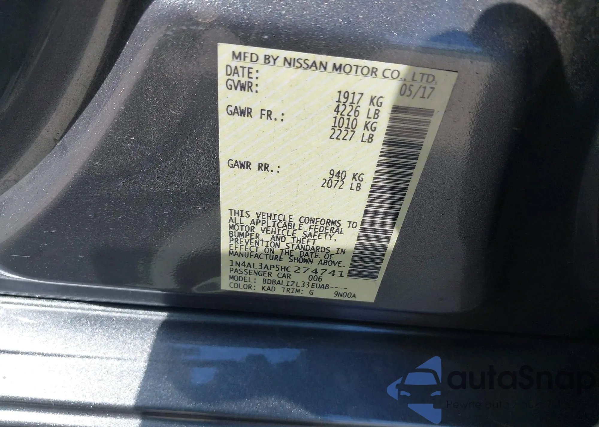 VIN: 1N4AL3AP5HC274741