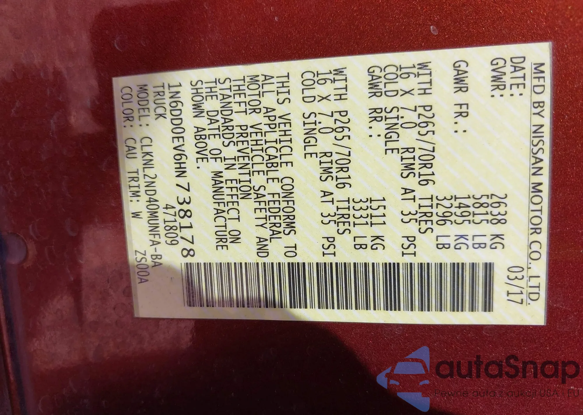 VIN: 1N6DD0EV6HN738178