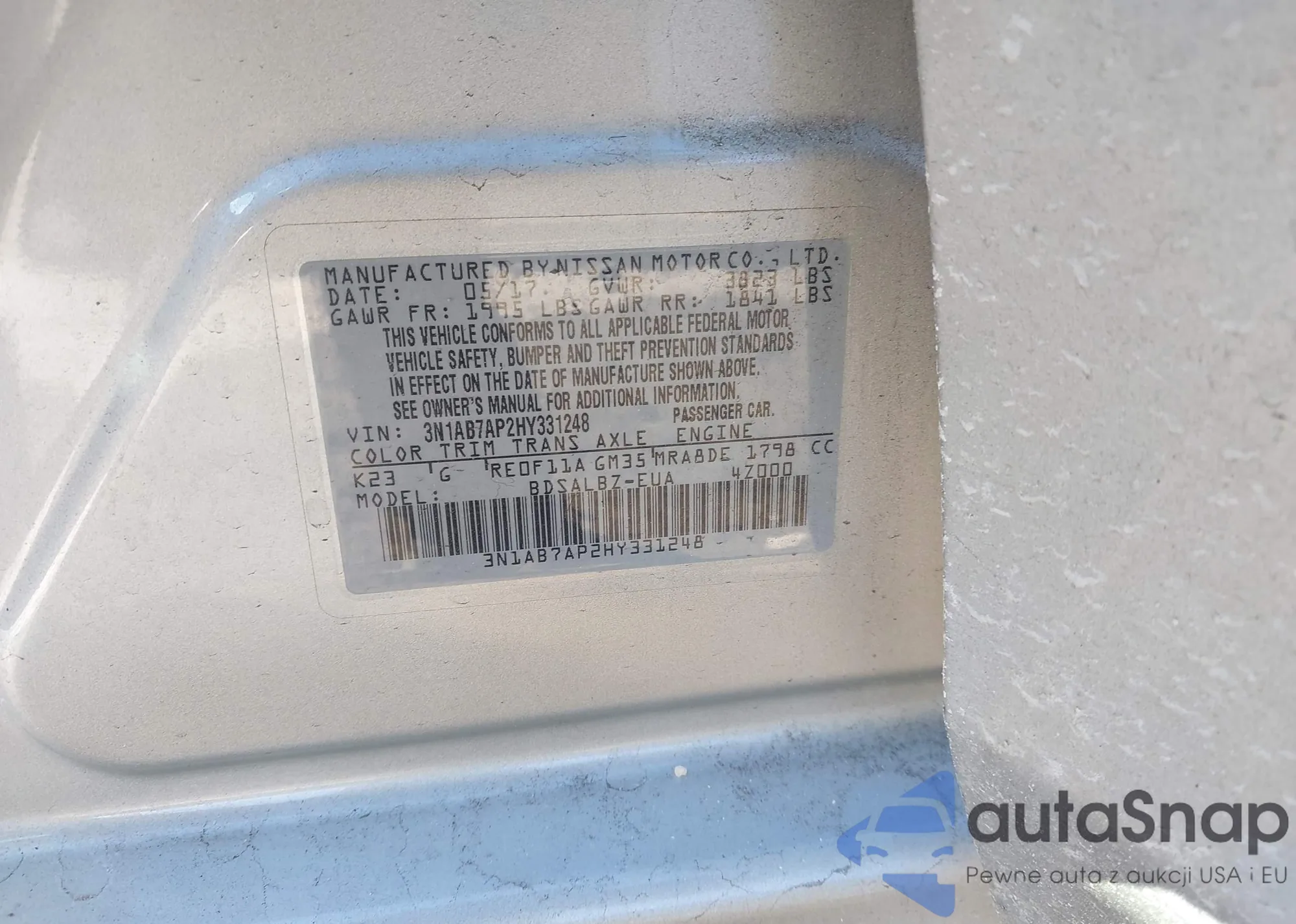 Автомобиль Nissan Sentra 2017 (VIN 3N1AB7AP2HY331248) ранее не участвовал в торгах. Документы чистые, пробег соответствует или ниже среднего по рынку. Продаётся страховой компанией — рекомендуем покупку. Доставка в порт займет около 6–8 недель.
