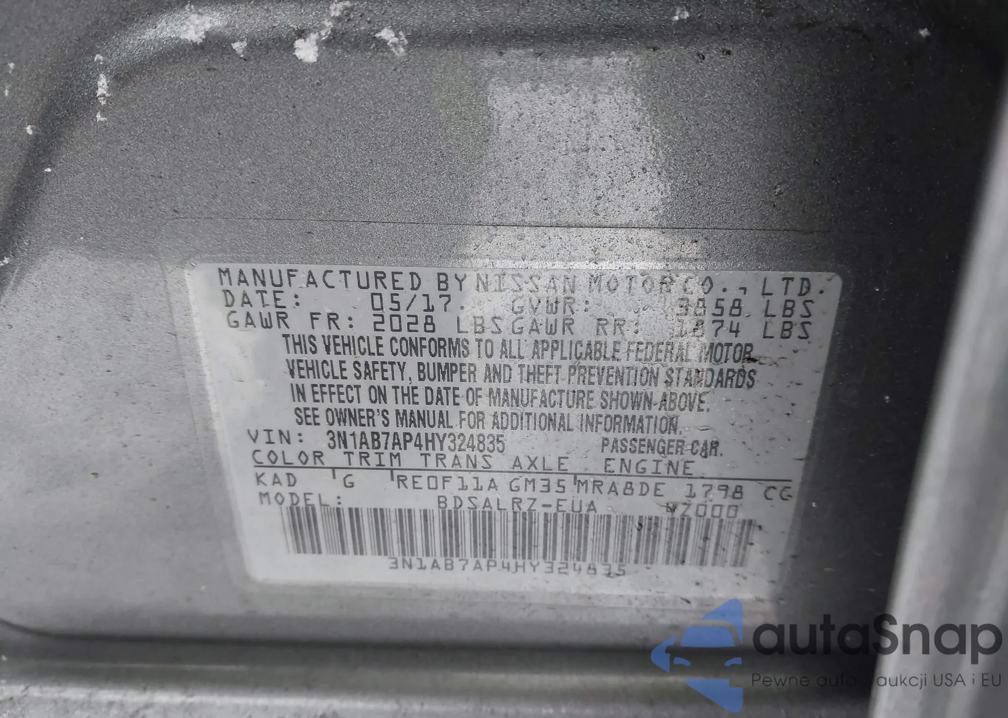 Автомобиль Nissan Sentra 2017 (VIN 3N1AB7AP4HY324835) ранее не участвовал в торгах. Документы чистые, пробег соответствует или ниже среднего по рынку. Продаётся страховой компанией — рекомендуем покупку. Доставка в порт займет около 6–8 недель.