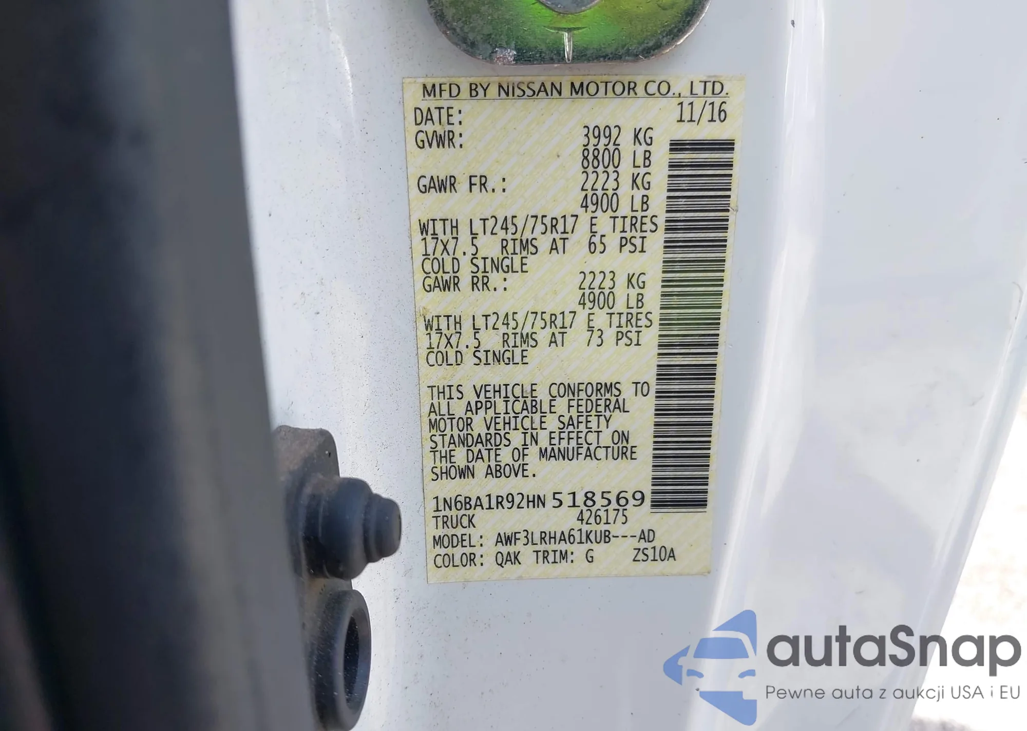 Автомобиль Nissan Titan 2017 (VIN 1N6BA1R92HN518569) имеет документы, препятствующие регистрации. Могут возникнуть сложности при экспорте и регистрации. Обратитесь к экспертам AutaSnap для поиска альтернатив.