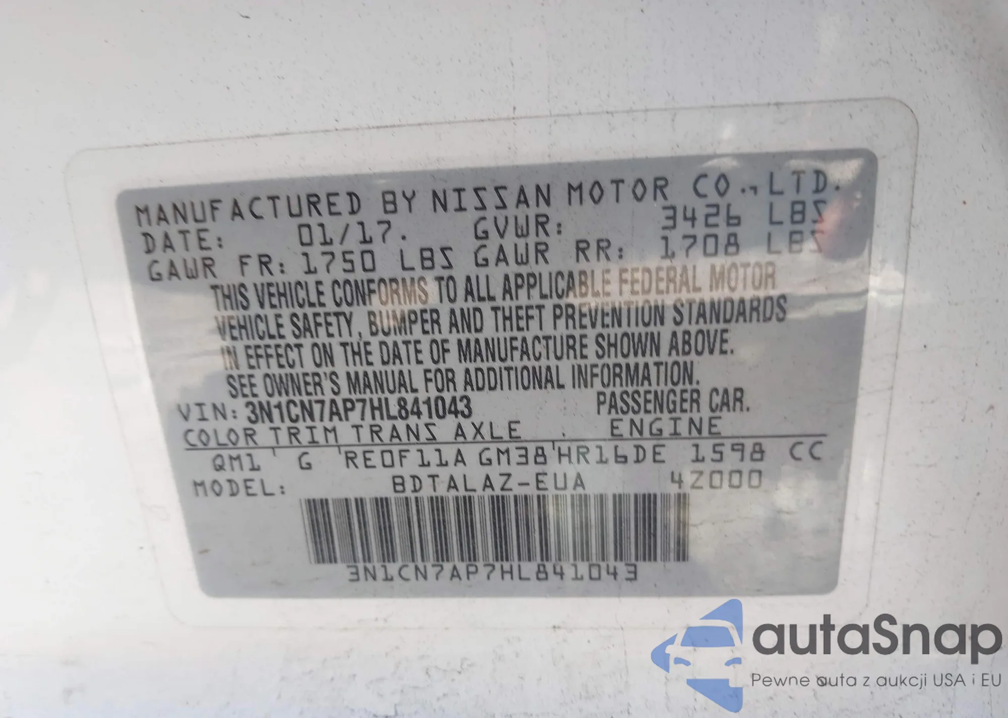 VIN: 3N1CN7AP7HL841043