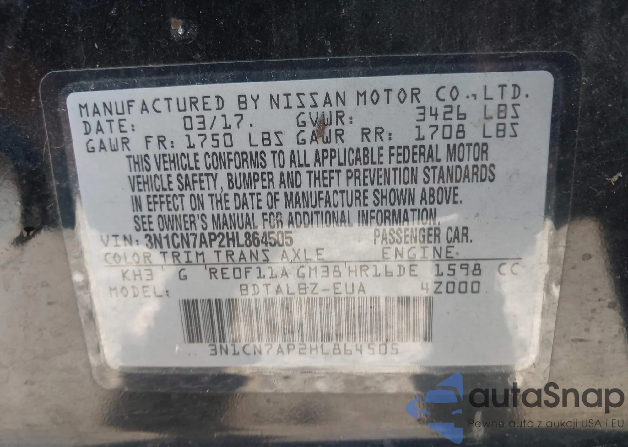VIN: 3N1CN7AP2HL864505