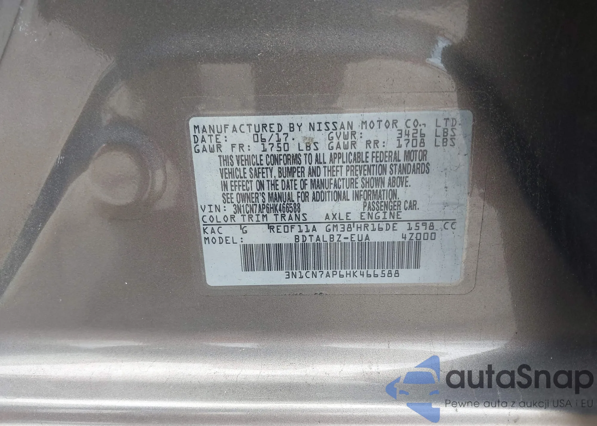 VIN: 3N1CN7AP6HK466588