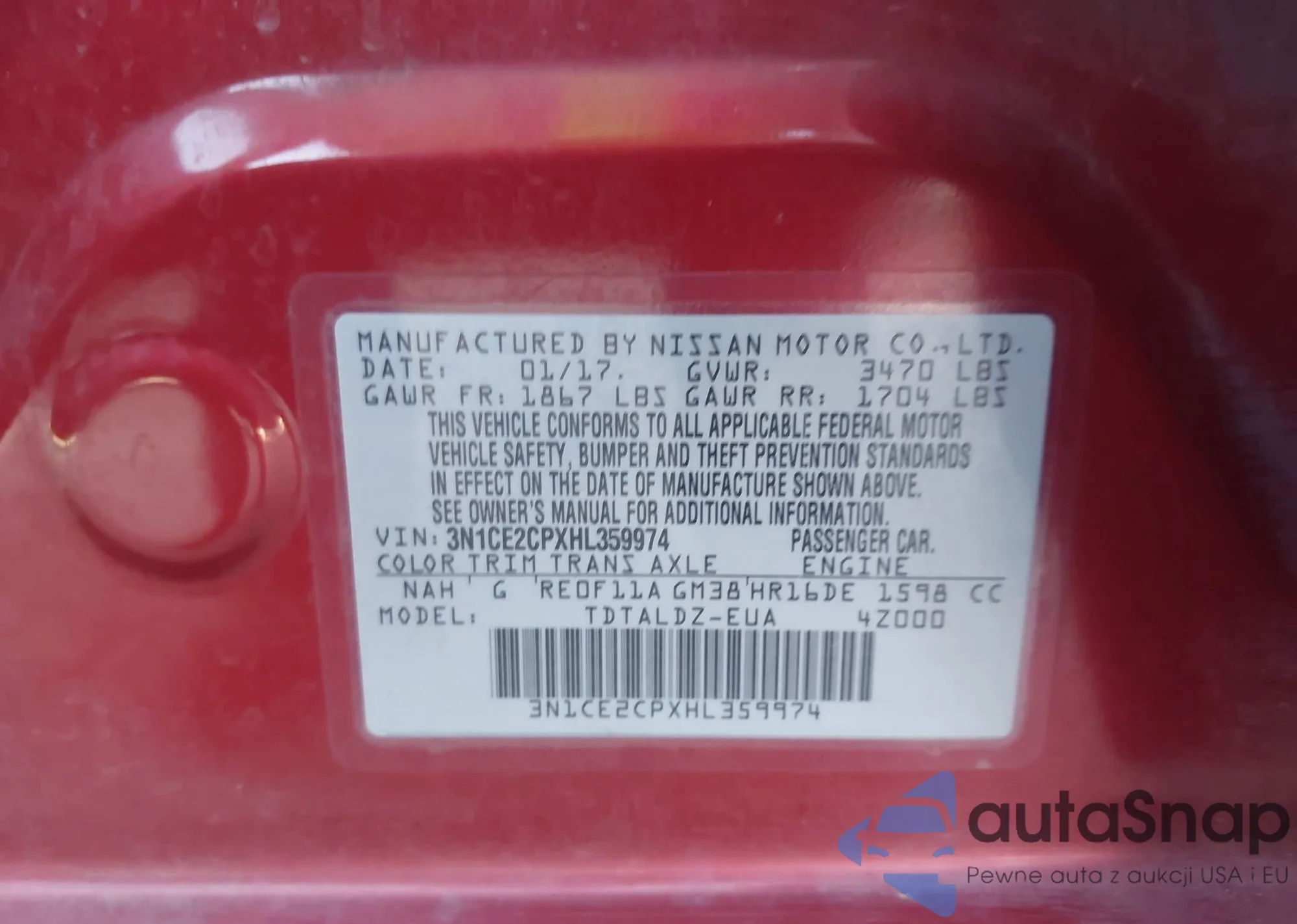 Автомобиль Nissan Versa 2017 (VIN 3N1CE2CPXHL359974) ранее не участвовал в торгах. Документы чистые, пробег соответствует или ниже среднего по рынку. Продаётся страховой компанией — рекомендуем покупку. Доставка в порт займет около 6–8 недель.