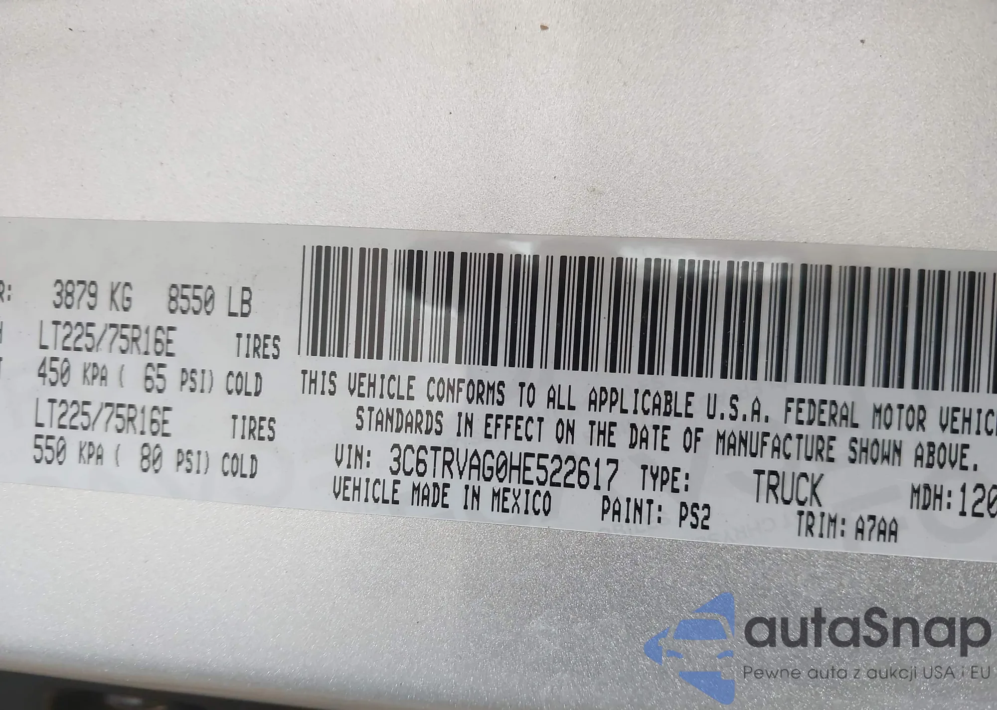 VIN: 3C6TRVAG0HE522617