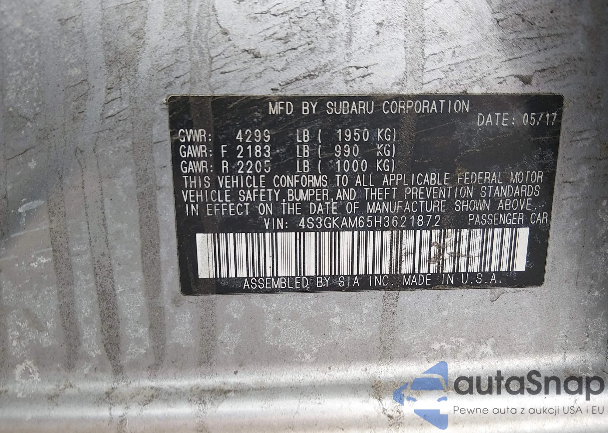 Автомобиль Subaru Impreza 2017 (VIN 4S3GKAM65H3621872) ранее не участвовал в торгах. Документы чистые, пробег соответствует или ниже среднего по рынку. Продаётся страховой компанией — рекомендуем покупку. Доставка в порт займет около 6–8 недель.