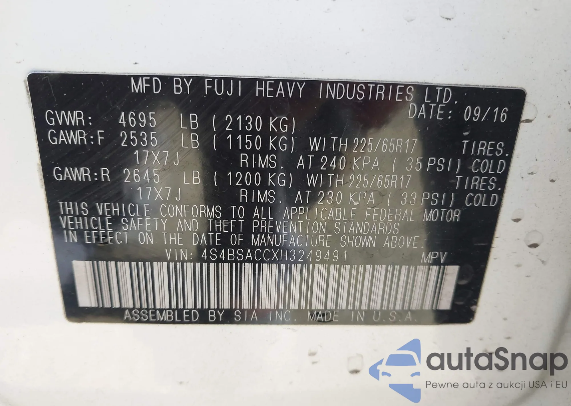 Автомобиль Subaru Outback 2017 (VIN 4S4BSACCXH3249491) ранее не участвовал в торгах. Документы чистые, пробег соответствует или ниже среднего по рынку. Продаётся страховой компанией — рекомендуем покупку. Доставка в порт займет около 6–8 недель.