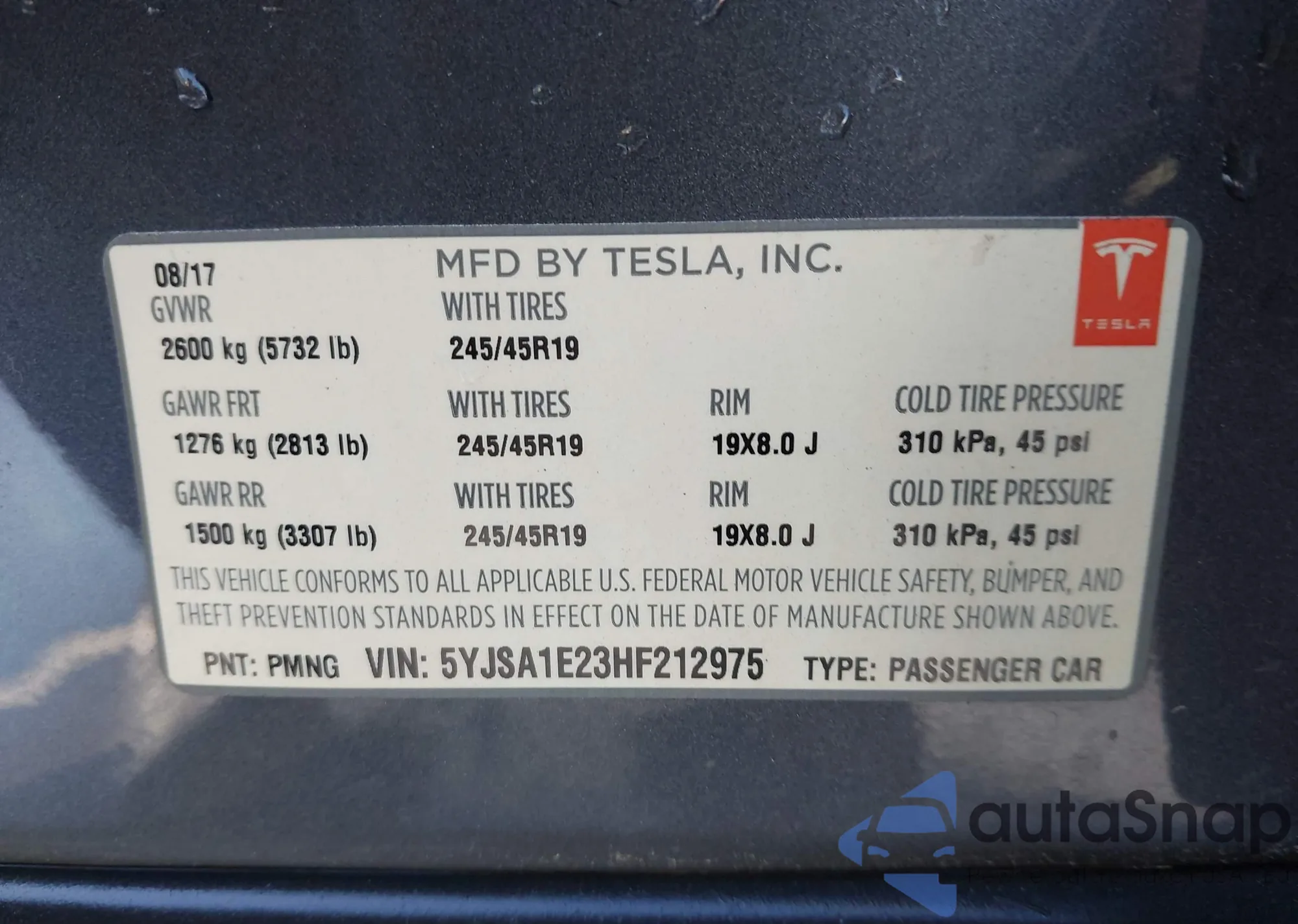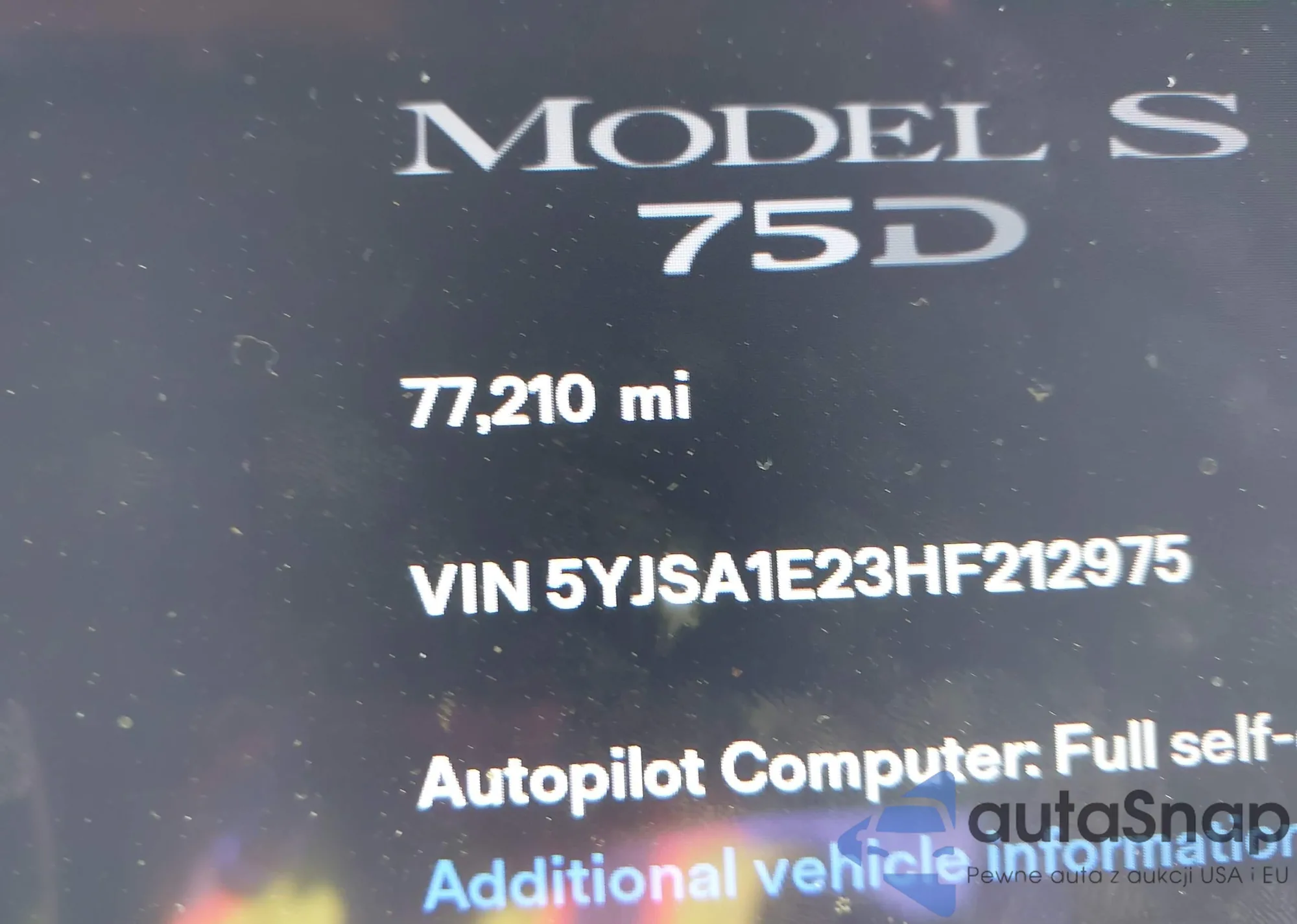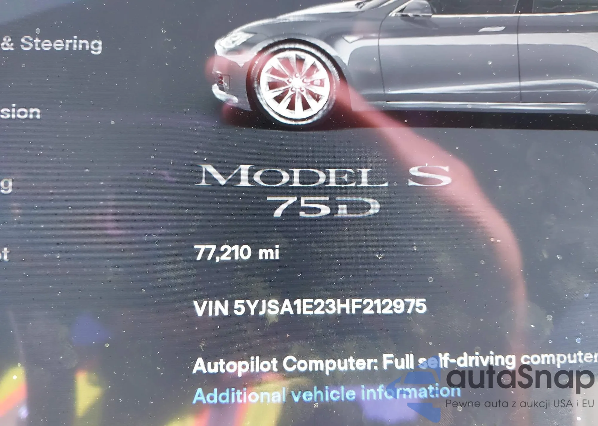 Автомобиль Tesla Model S 2017 (VIN 5YJSA1E23HF212975) ранее не участвовал в торгах. Документы чистые, пробег соответствует или ниже среднего по рынку. Продаётся страховой компанией — рекомендуем покупку. Доставка в порт займет около 6–8 недель.
