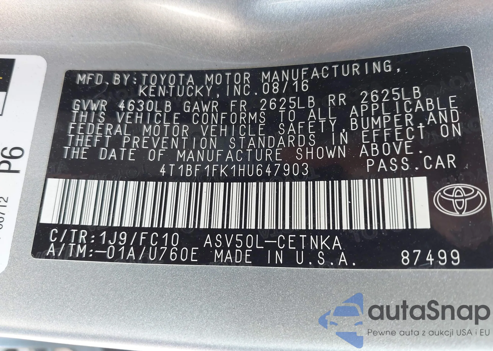 VIN: 4T1BF1FK1HU647903