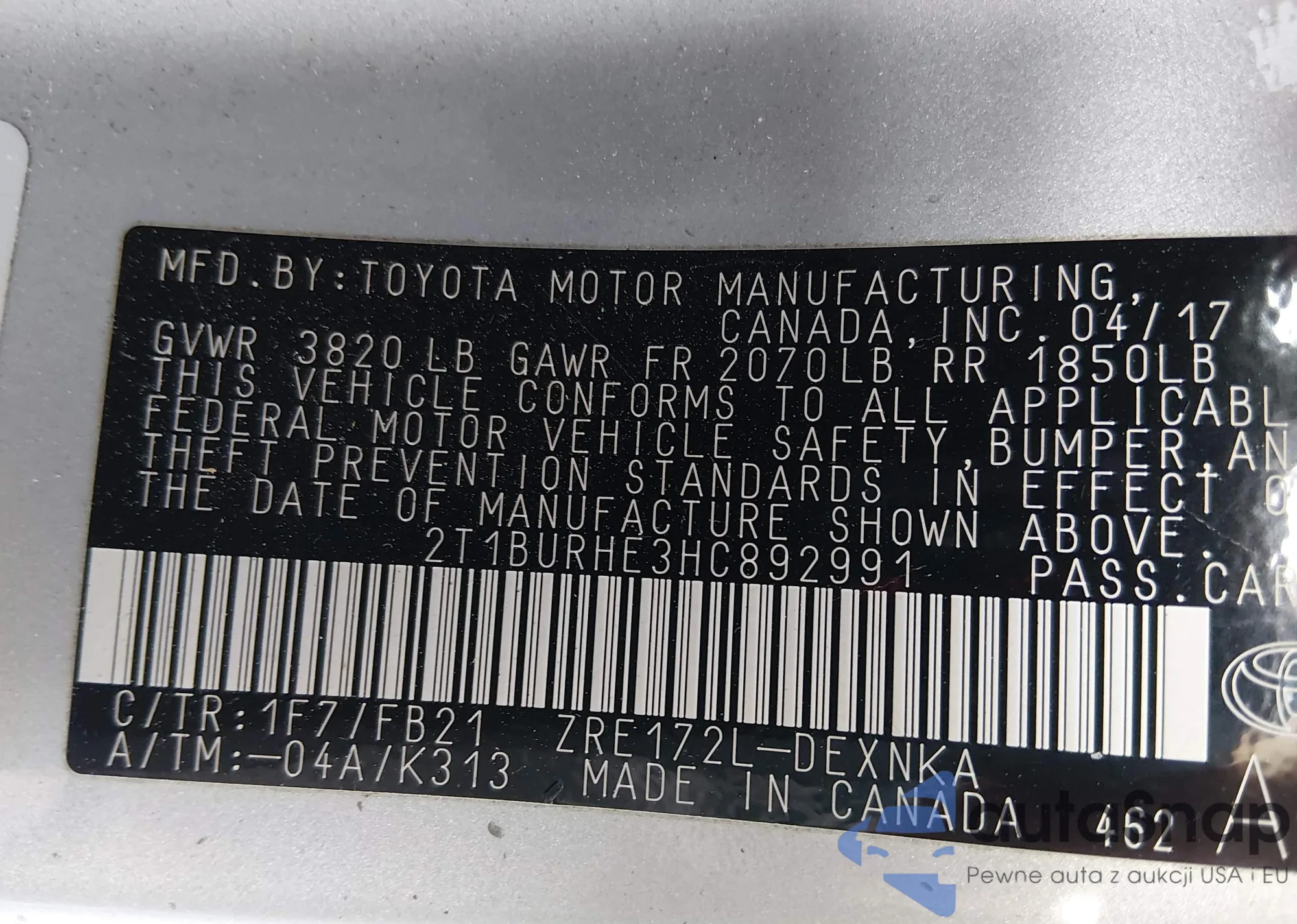 Автомобиль Toyota Corolla 2017 (VIN 2T1BURHE3HC892991) ранее не участвовал в торгах. Документы чистые, пробег соответствует или ниже среднего по рынку. Продаётся страховой компанией — рекомендуем покупку. Доставка в порт займет около 6–8 недель.