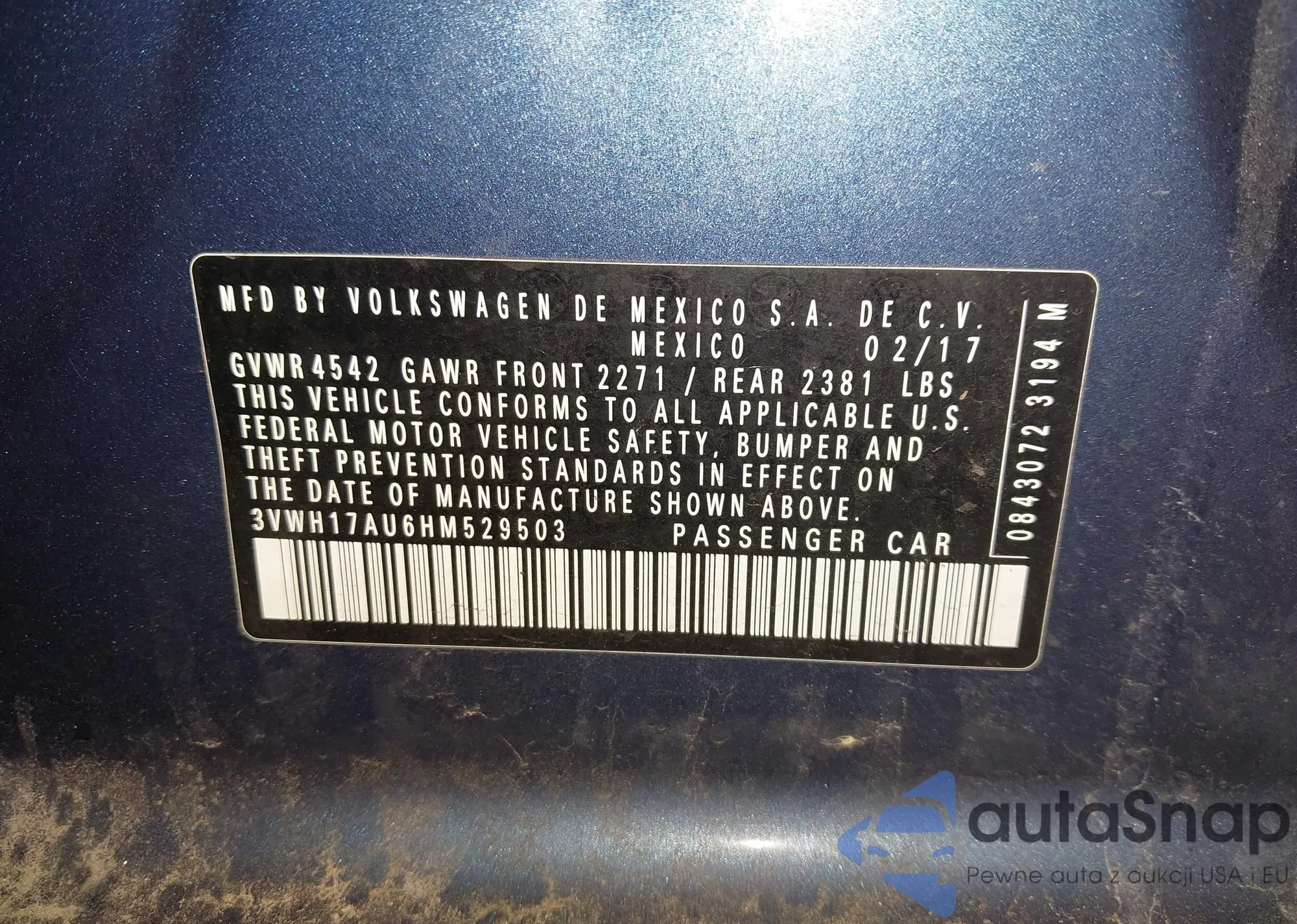 • VIN: 3VWH17AU6HM529503