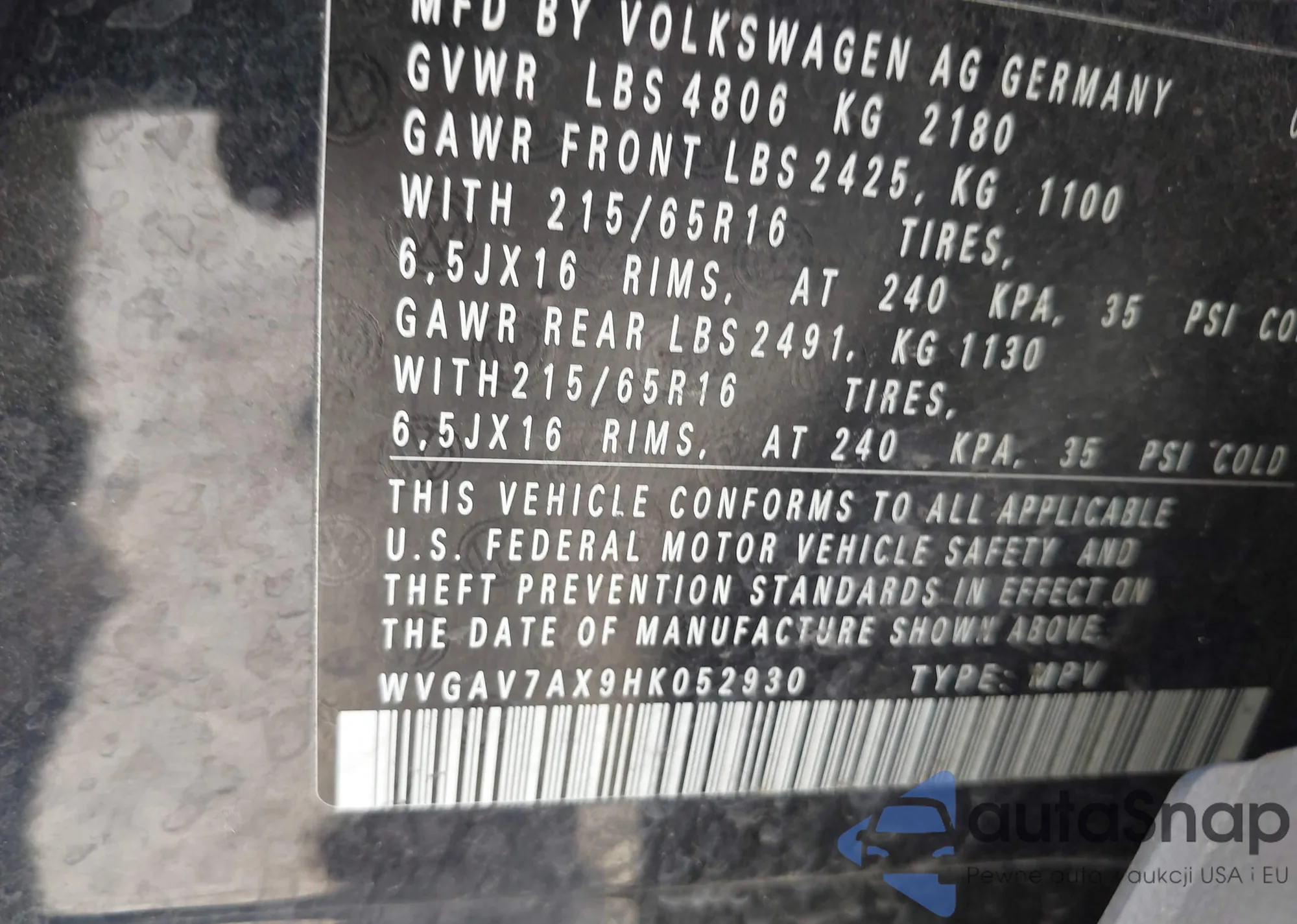 VIN: WVGAV7AX9HK052930