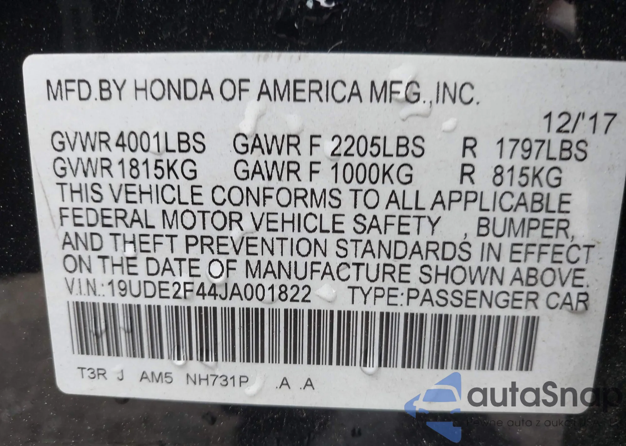 VIN: 19UDE2F44JA001822