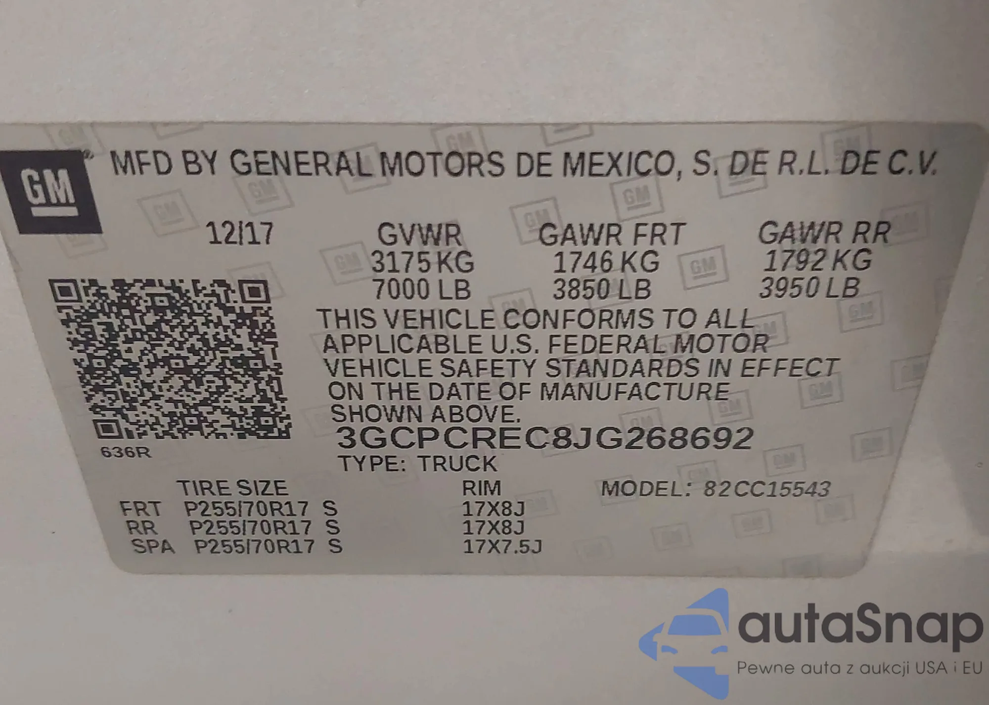 • VIN: 3GCPCREC8JG268692