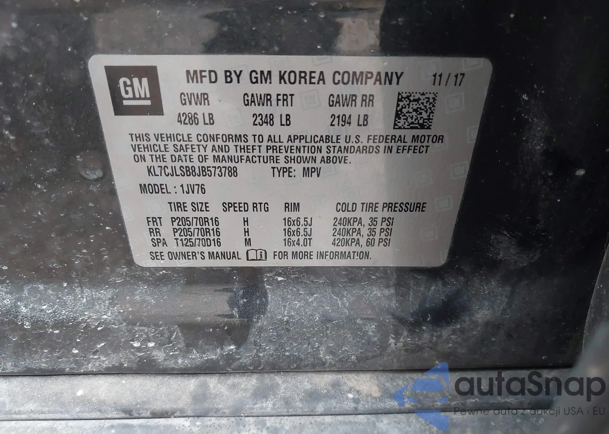 Автомобиль Chevrolet Trax 2018 (VIN KL7CJLSB8JB573788) ранее не участвовал в торгах. Документы чистые, пробег соответствует или ниже среднего по рынку. Продаётся страховой компанией — рекомендуем покупку. Доставка в порт займет около 6–8 недель.