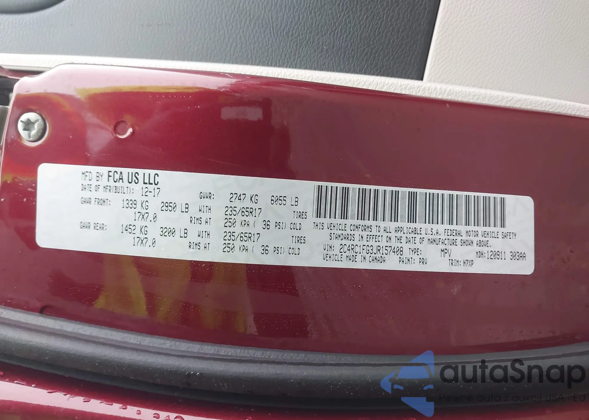Автомобиль Chrysler Pacifica 2018 (VIN 2C4RC1FG3JR157408) имеет документы, препятствующие регистрации. Могут возникнуть сложности при экспорте и регистрации. Обратитесь к экспертам AutaSnap для поиска альтернатив.