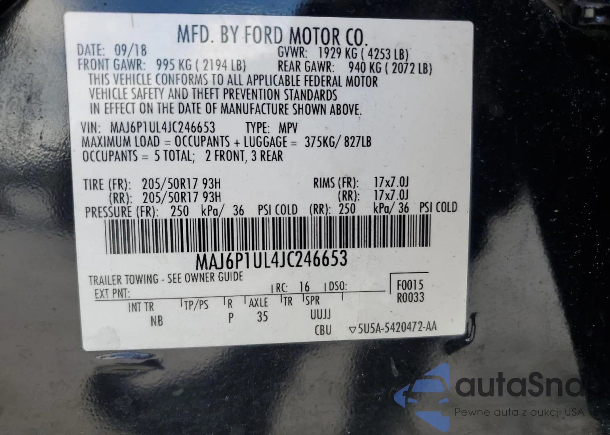 Автомобиль Ford EcoSport 2018 (VIN MAJ6P1UL4JC246653) имеет документы, препятствующие регистрации. Могут возникнуть сложности при экспорте и регистрации. Обратитесь к экспертам AutaSnap для поиска альтернатив.