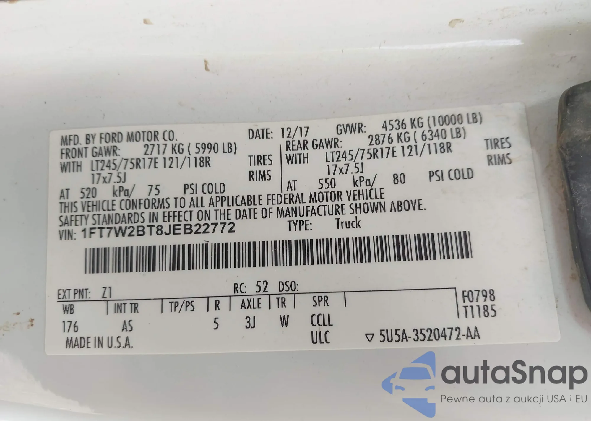 Автомобиль Ford F250 2018 (VIN 1FT7W2BT8JEB22772) ранее не участвовал в торгах. Документы чистые, пробег соответствует или ниже среднего по рынку. Продаётся страховой компанией — рекомендуем покупку. Доставка в порт займет около 6–8 недель.