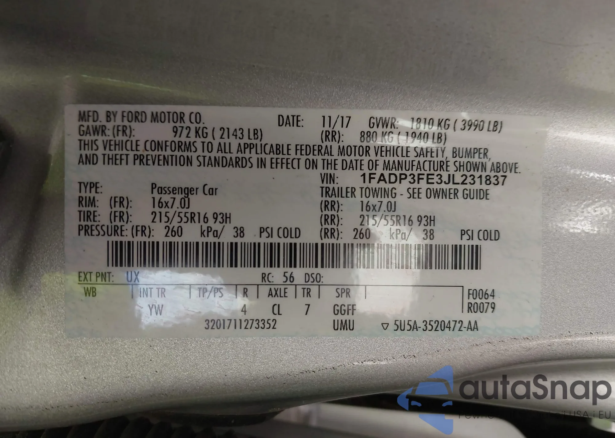 VIN: 1FADP3FE3JL231837