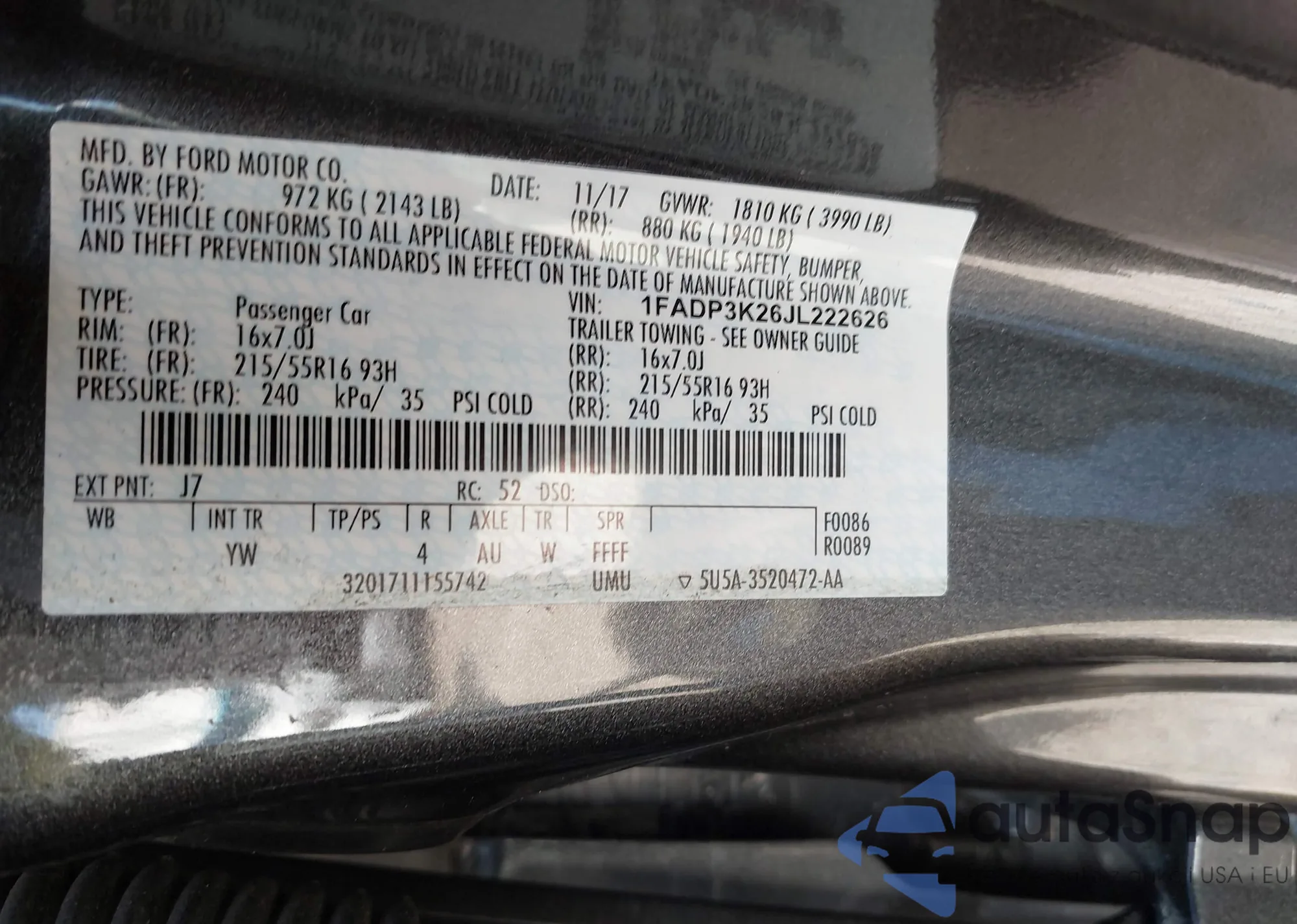 VIN: 1FADP3K26JL222626