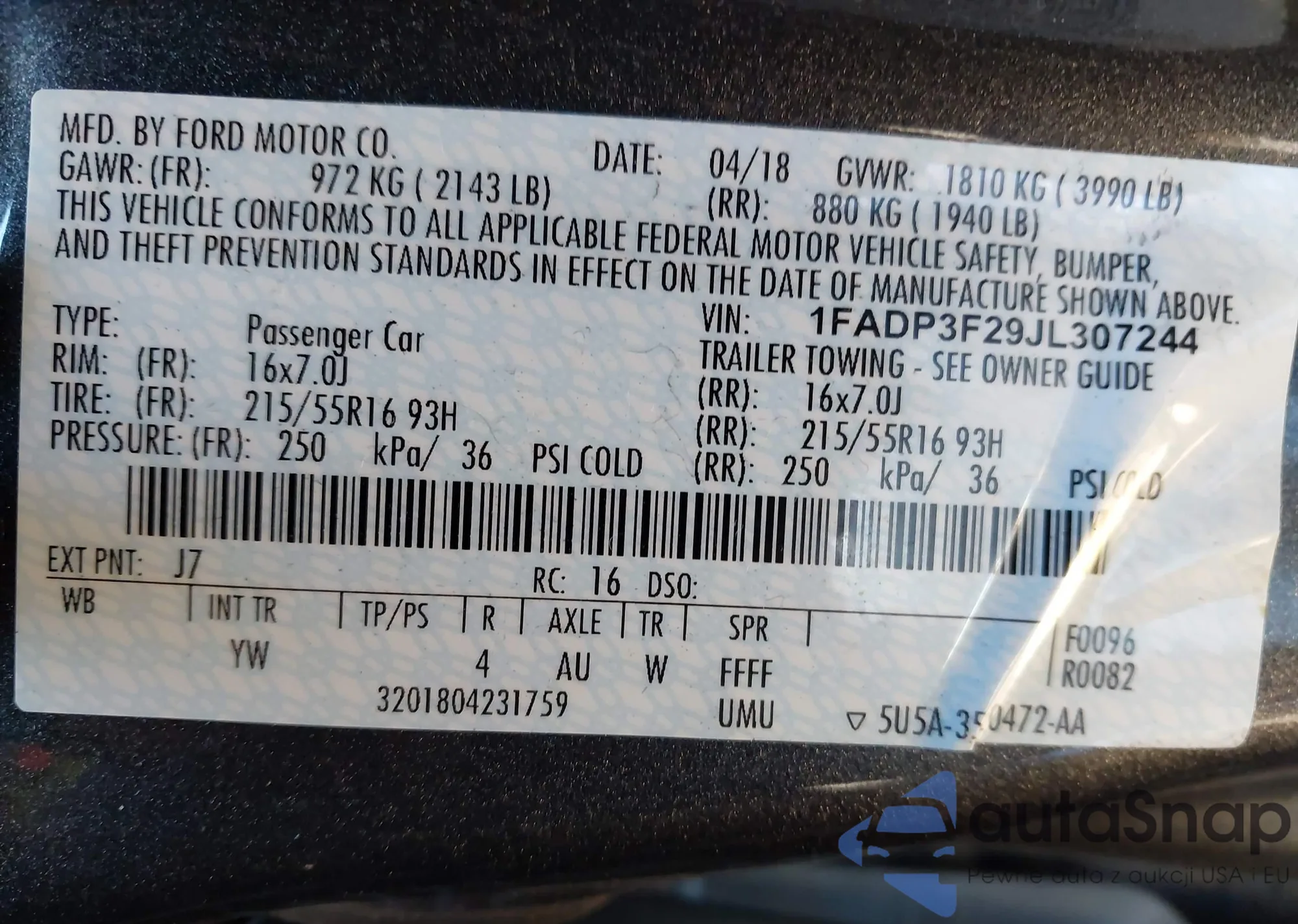 VIN: 1FADP3F29JL307244