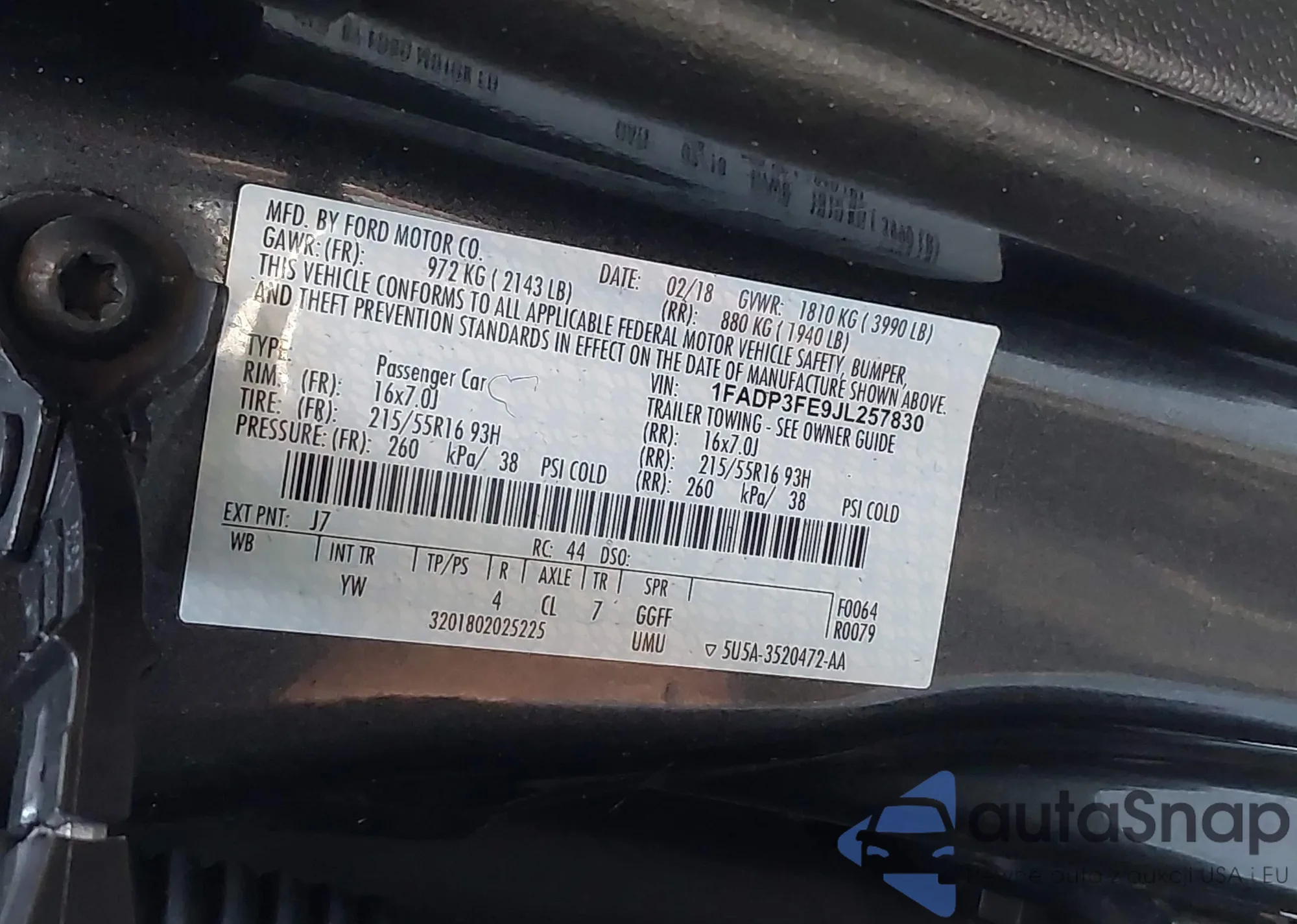 VIN: 1FADP3FE9JL257830