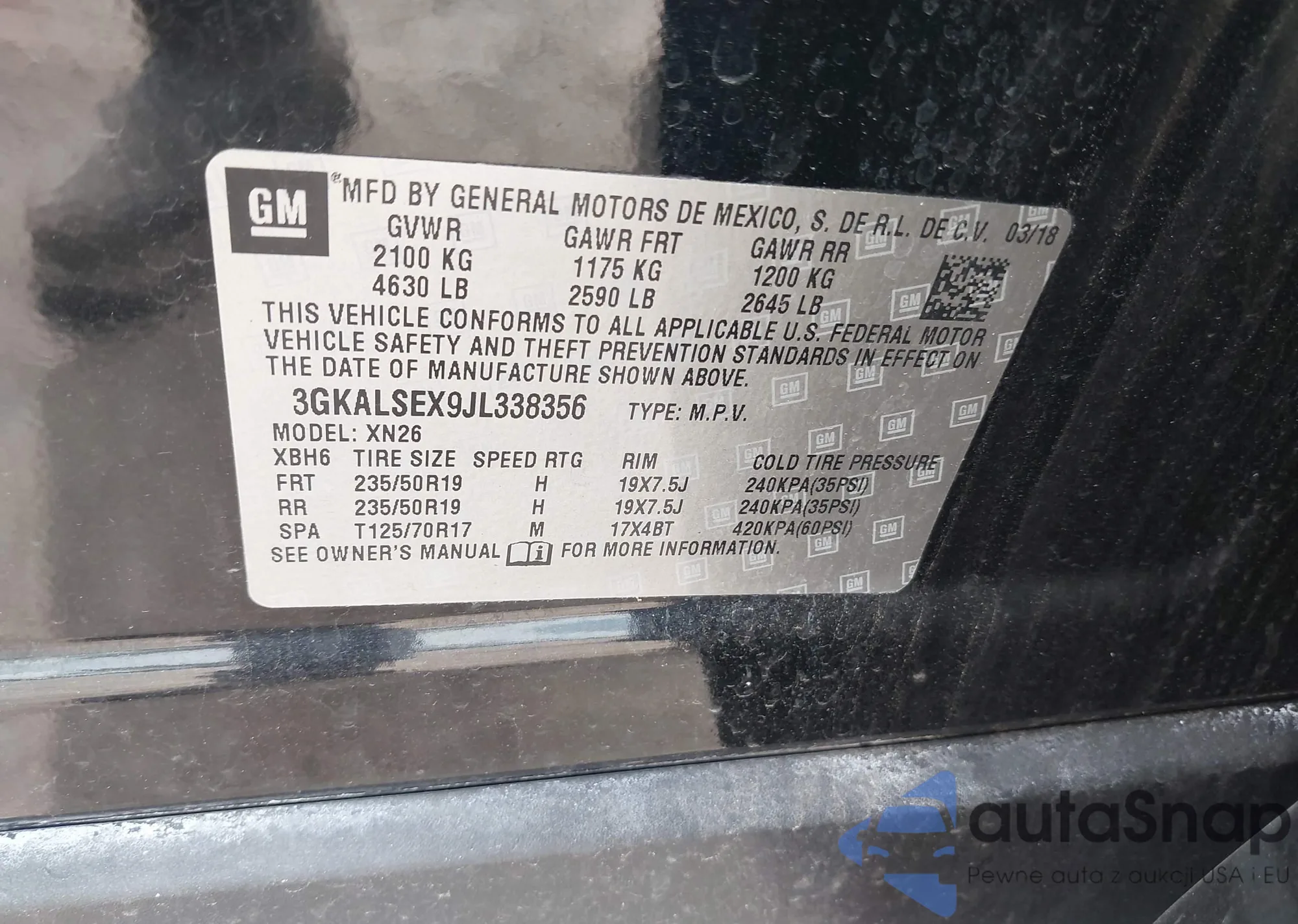 Автомобиль GMC Terrain 2018 (VIN 3GKALSEX9JL338356) имеет документы, препятствующие регистрации. Могут возникнуть сложности при экспорте и регистрации. Обратитесь к экспертам AutaSnap для поиска альтернатив.