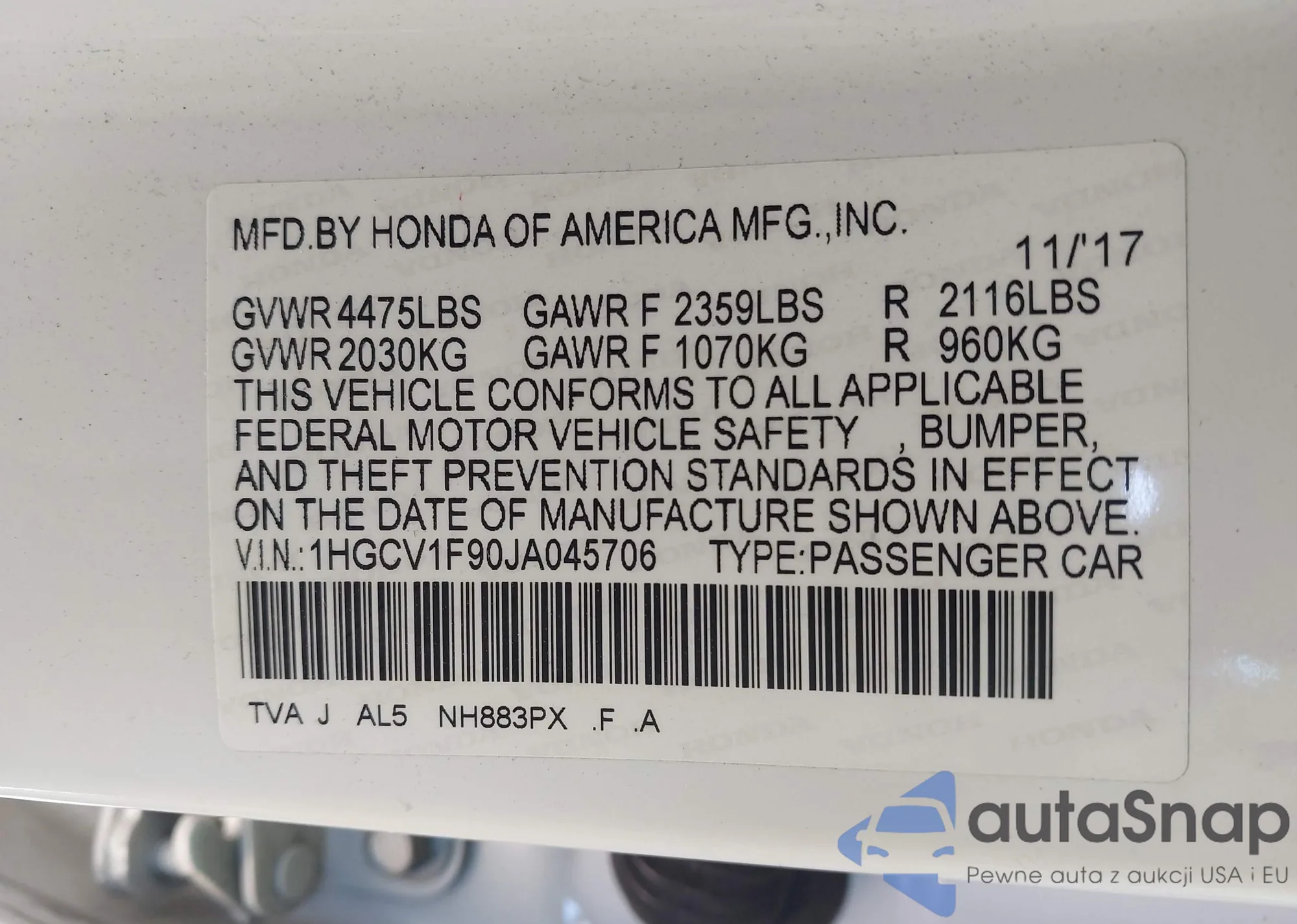 VIN: 1HGCV1F90JA045706