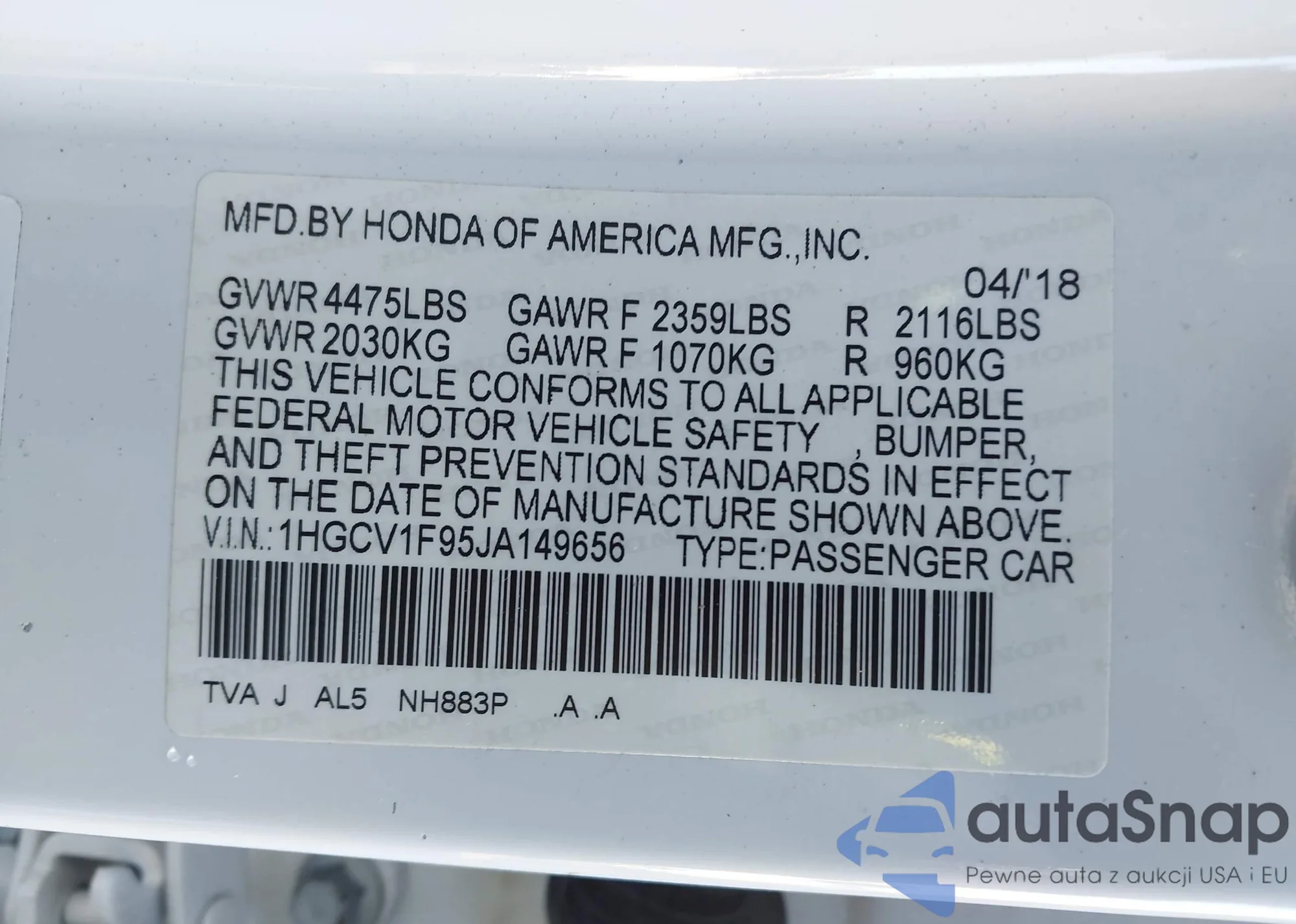 VIN: 1HGCV1F95JA149656