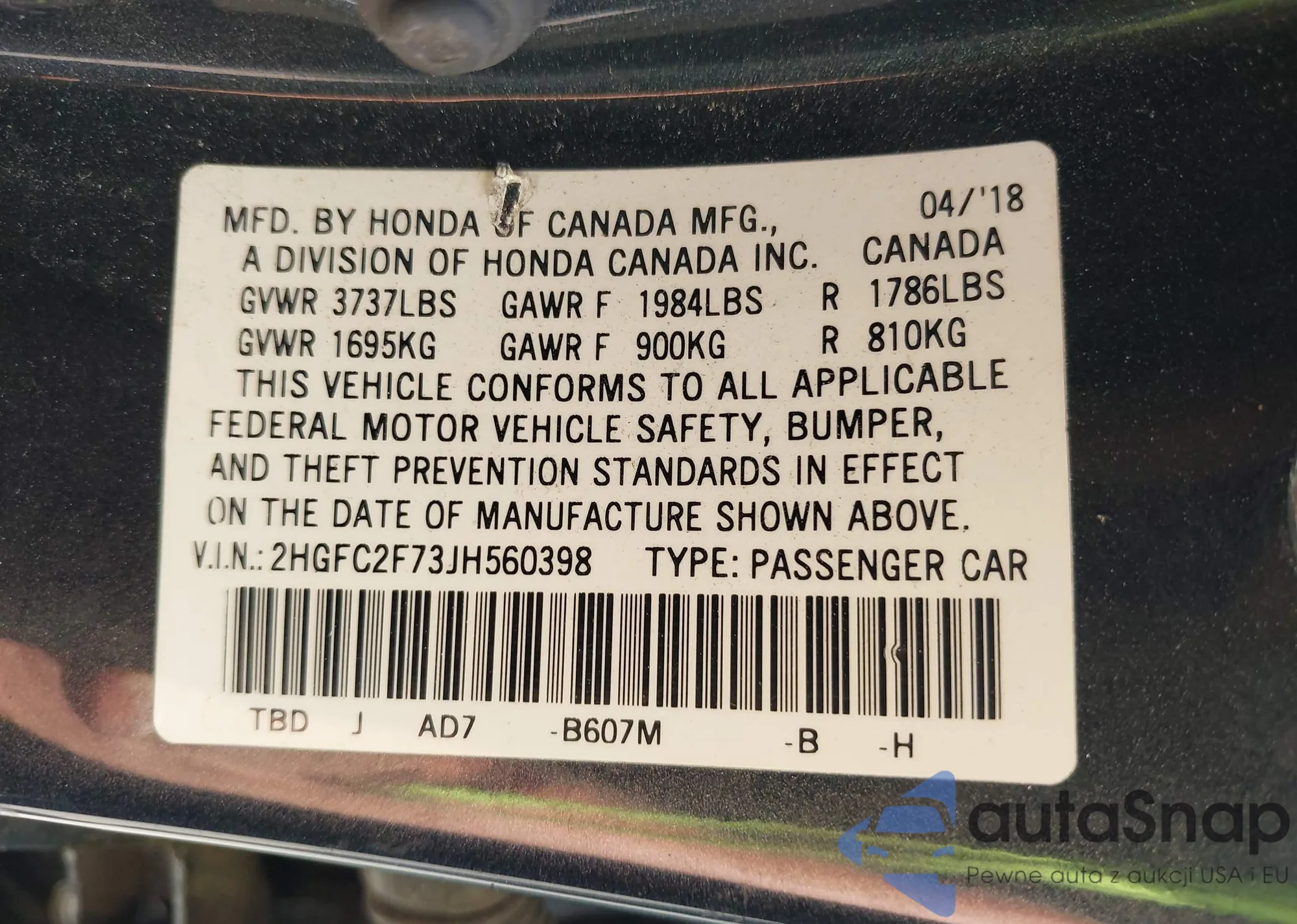 VIN: 2HGFC2F73JH560398