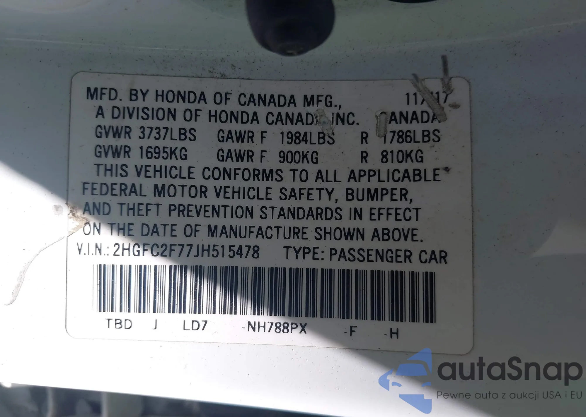 VIN: 2HGFC2F77JH515478
