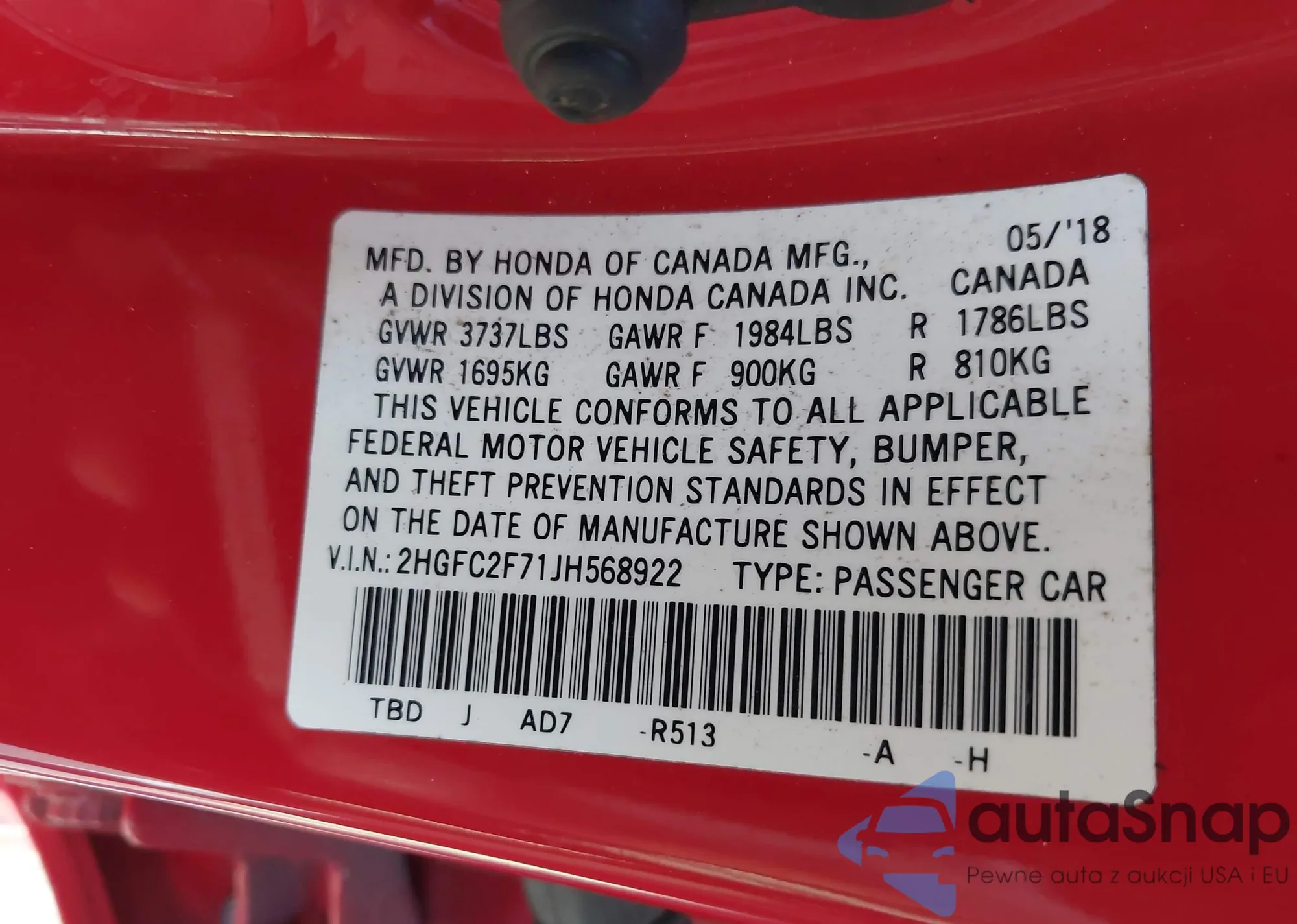 VIN: 2HGFC2F71JH568922