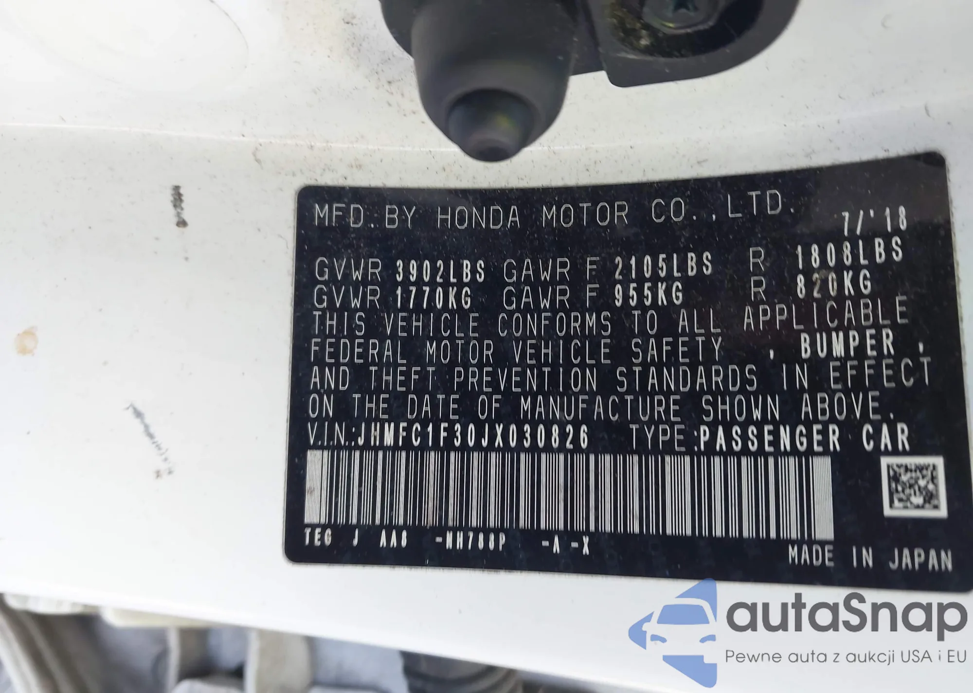 Автомобиль Honda Civic 2018 (VIN JHMFC1F30JX030826) ранее не участвовал в торгах. Документы чистые, пробег соответствует или ниже среднего по рынку. Продаётся страховой компанией — рекомендуем покупку. Доставка в порт займет около 6–8 недель.