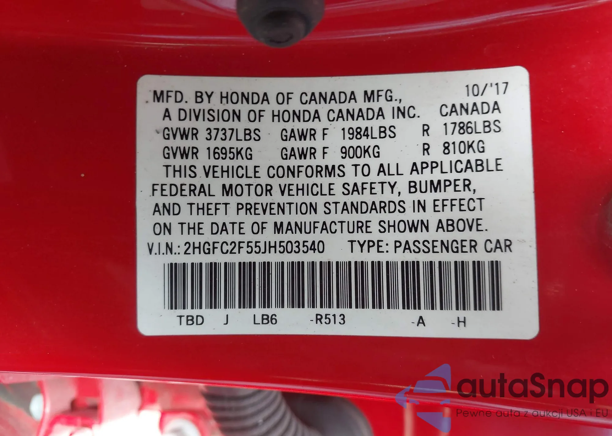 VIN: 2HGFC2F55JH503540