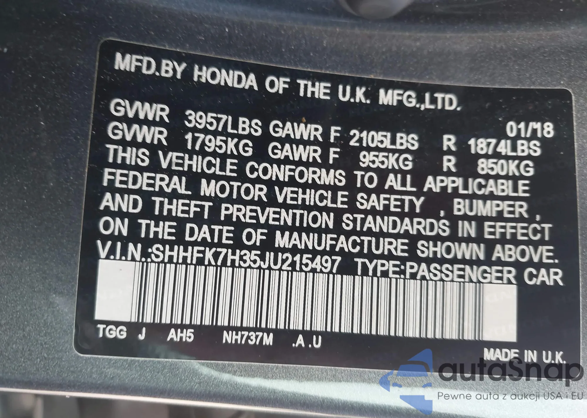 VIN: SHHFK7H35JU215497