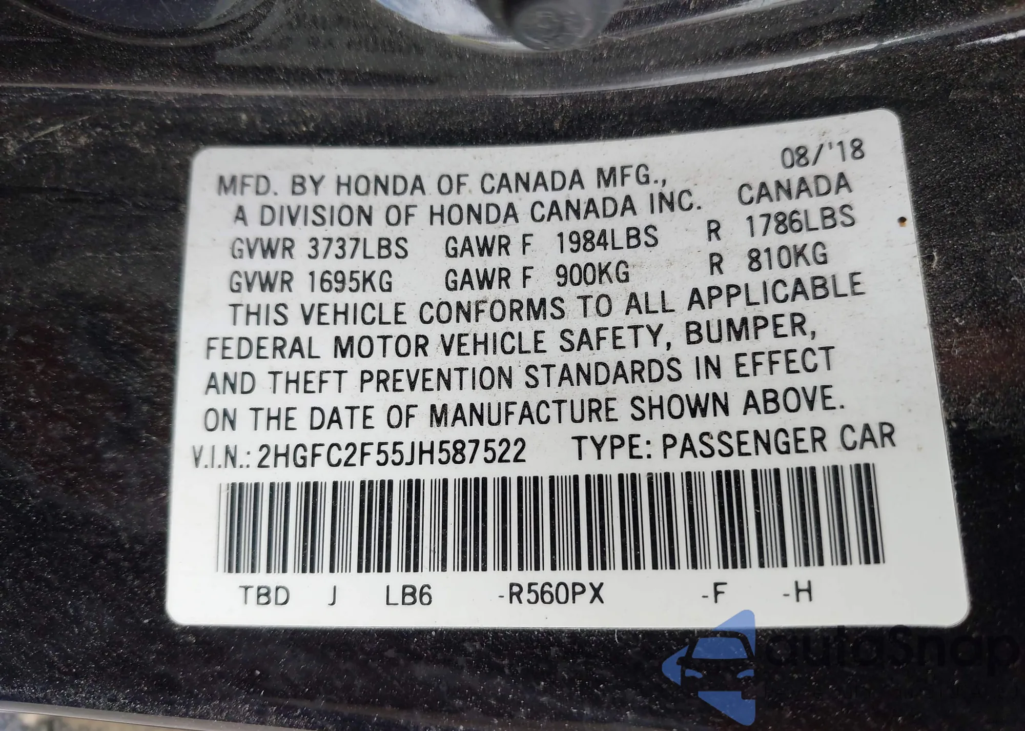 VIN: 2HGFC2F55JH587522