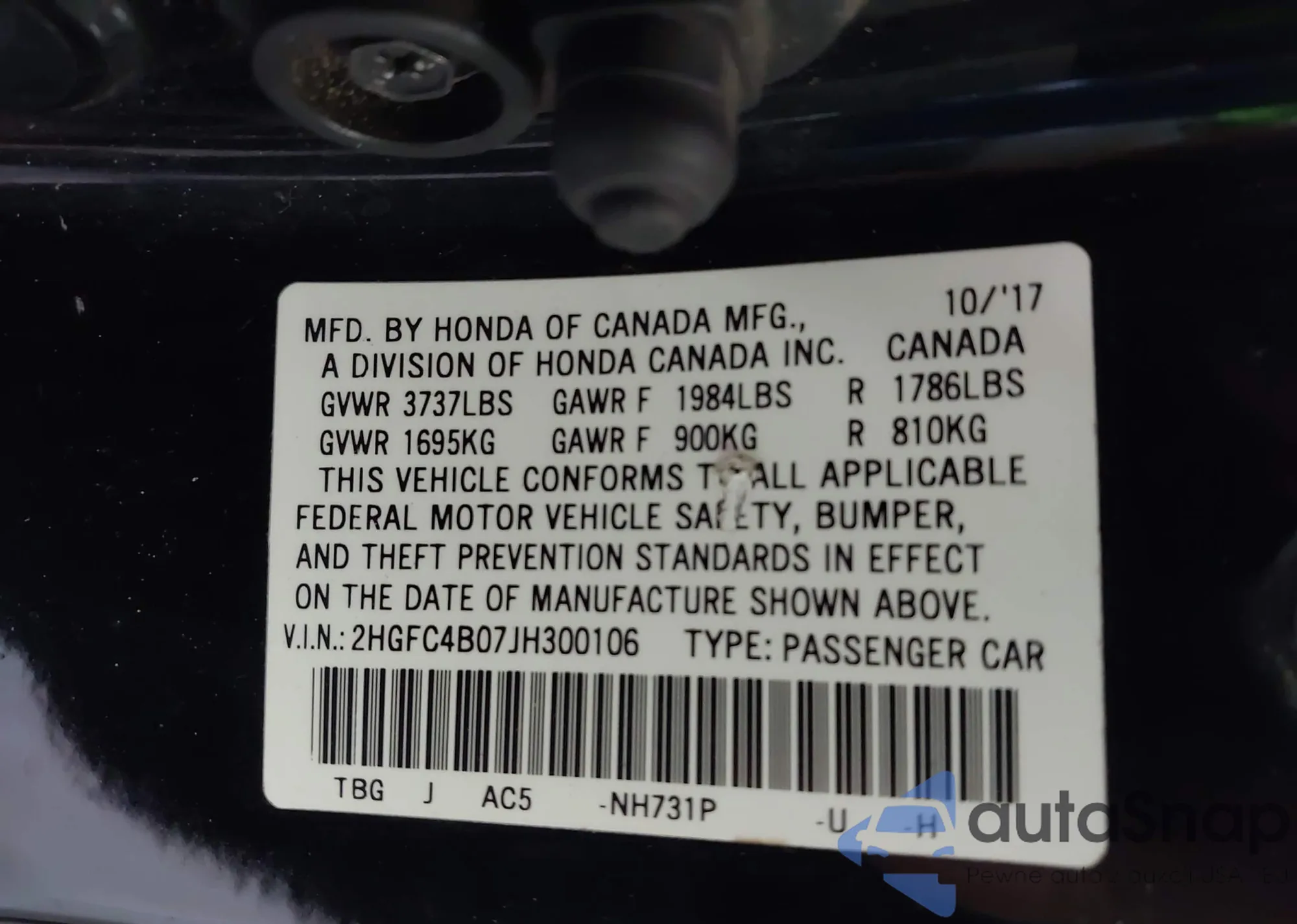 VIN: 2HGFC4B07JH300106