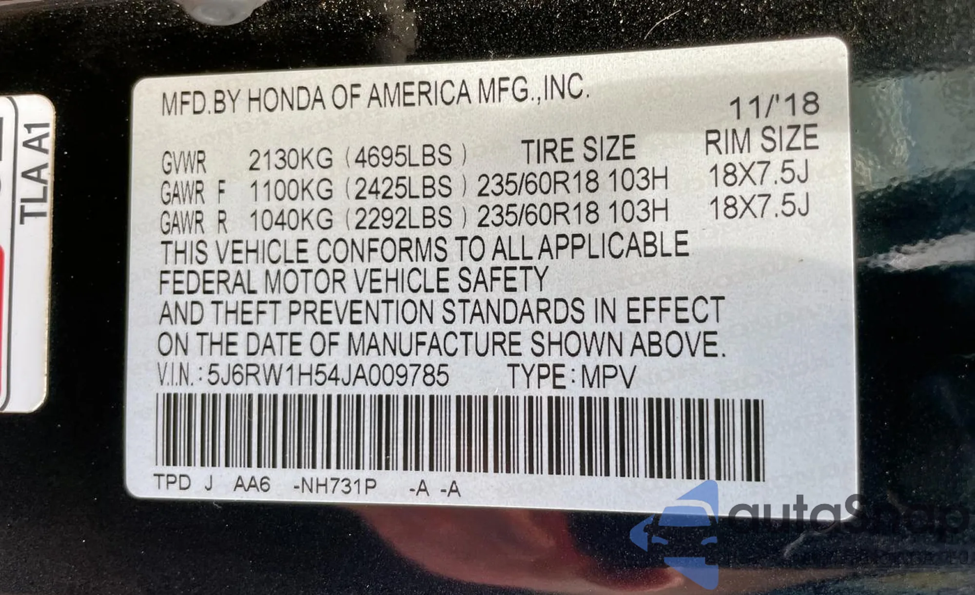 VIN: 5J6RW1H54JA009785