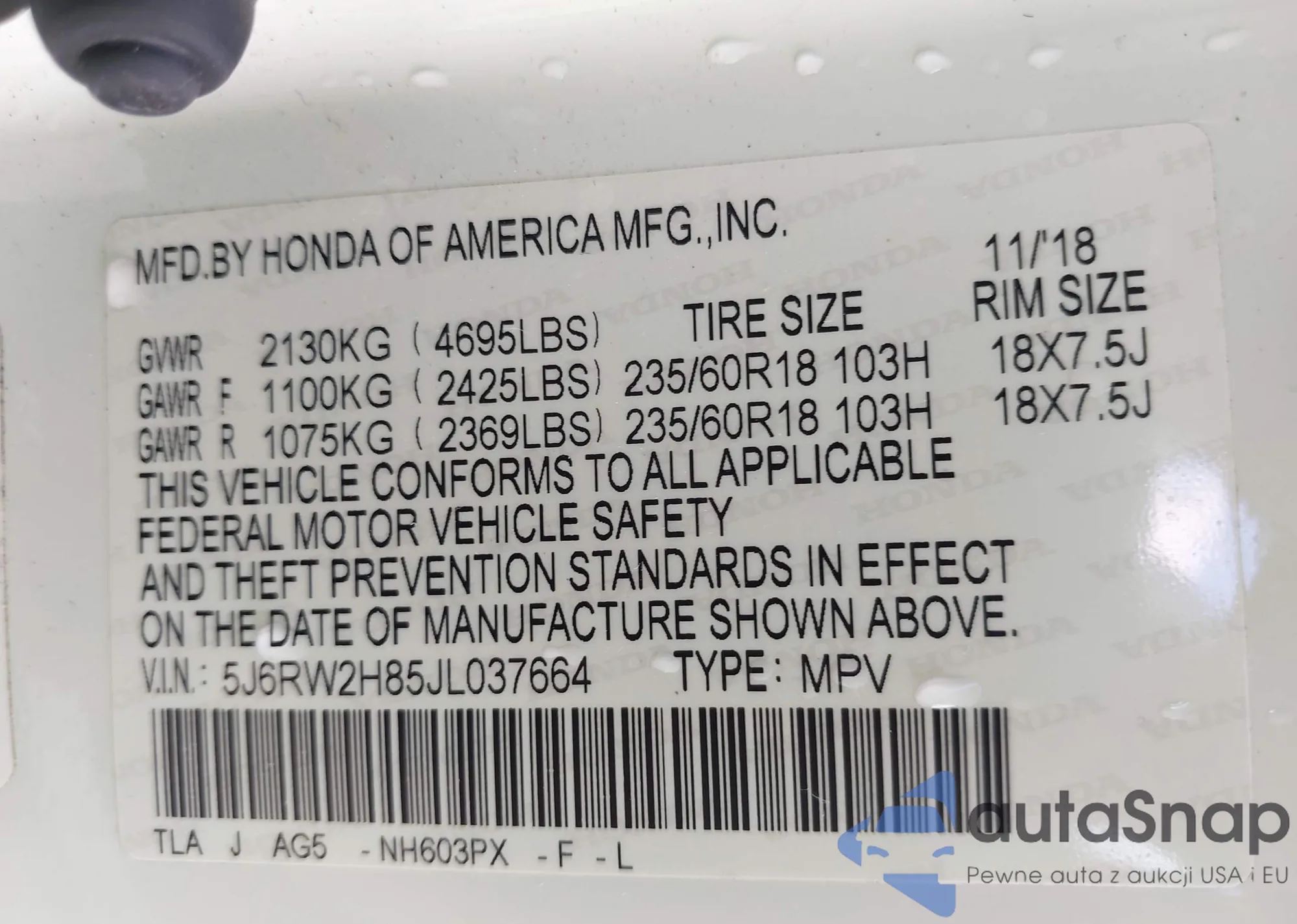 VIN: 5J6RW2H85JL037664