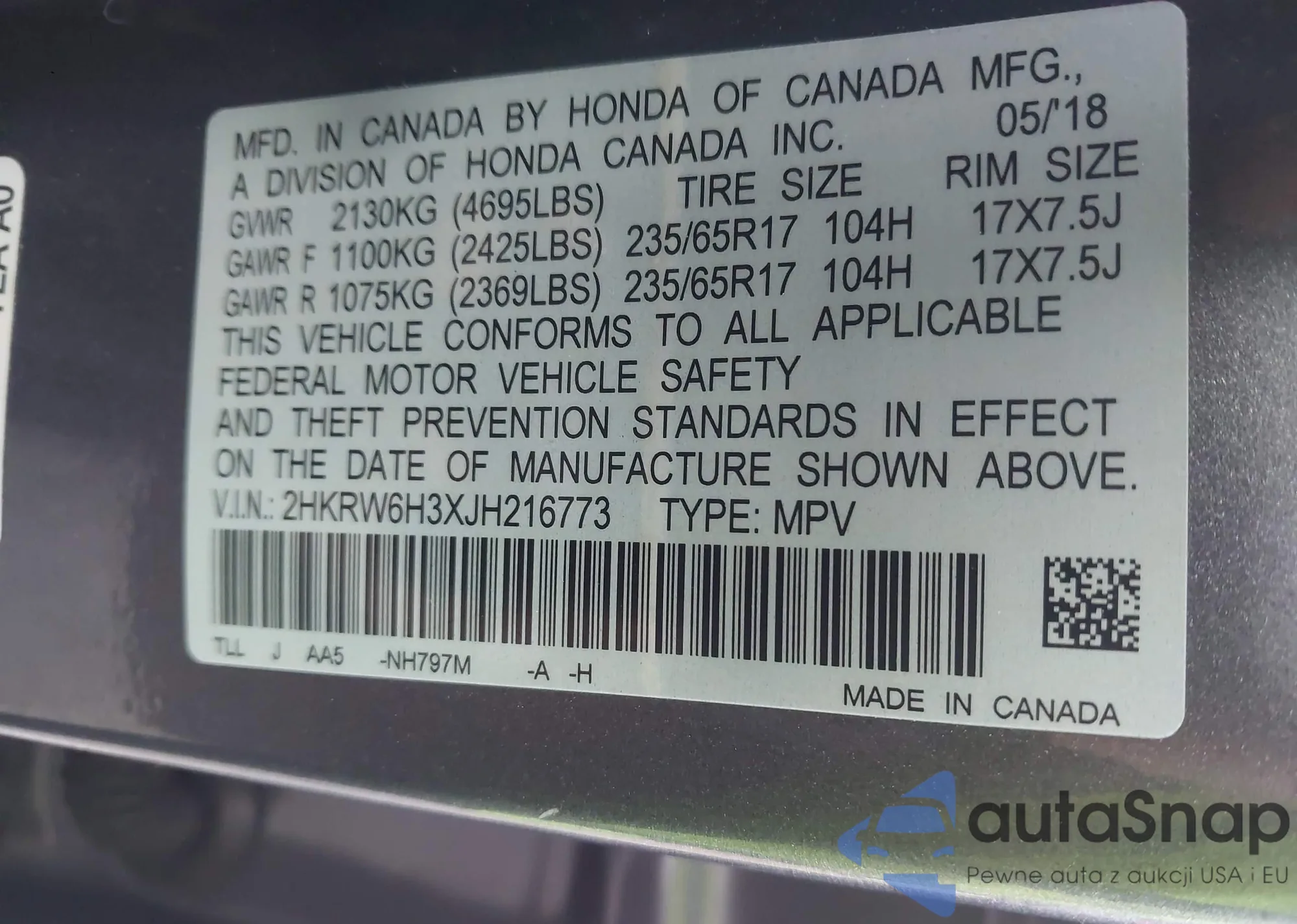 VIN: 2HKRW6H3XJH216773