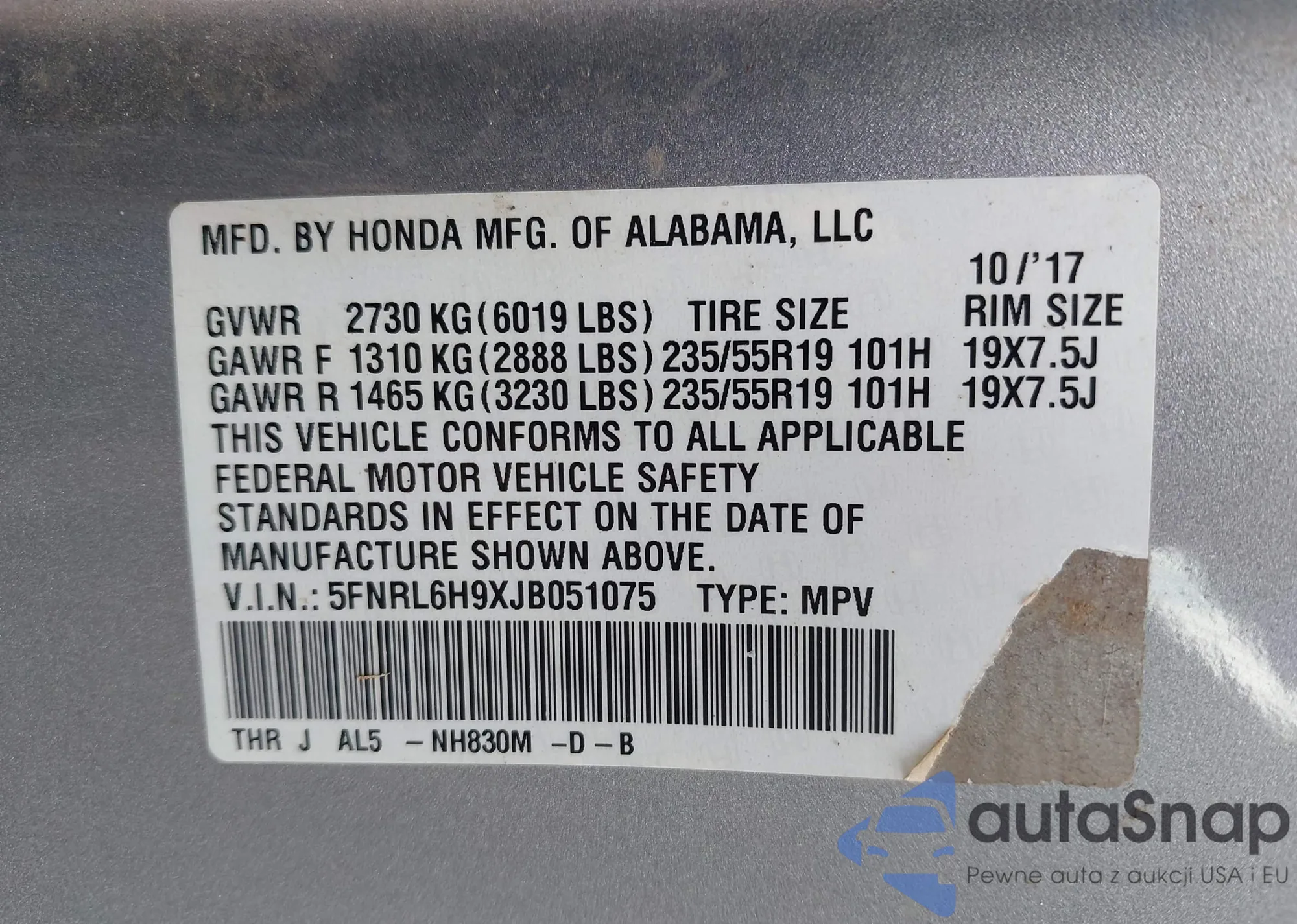 VIN: 5FNRL6H9XJB051075