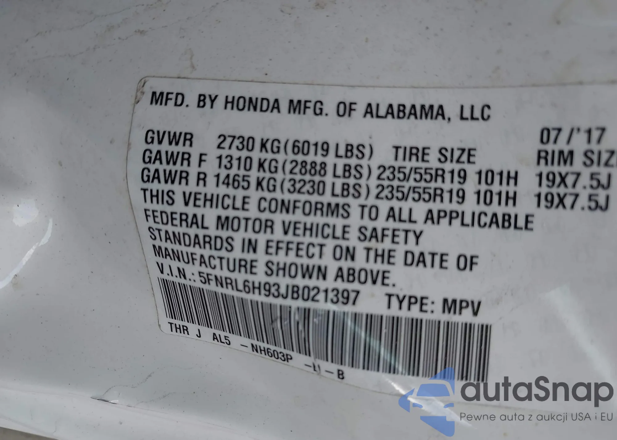 VIN: 5FNRL6H93JB021397