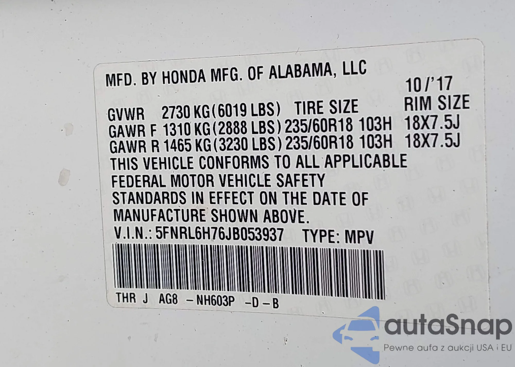 VIN: 5FNRL6H76JB053937